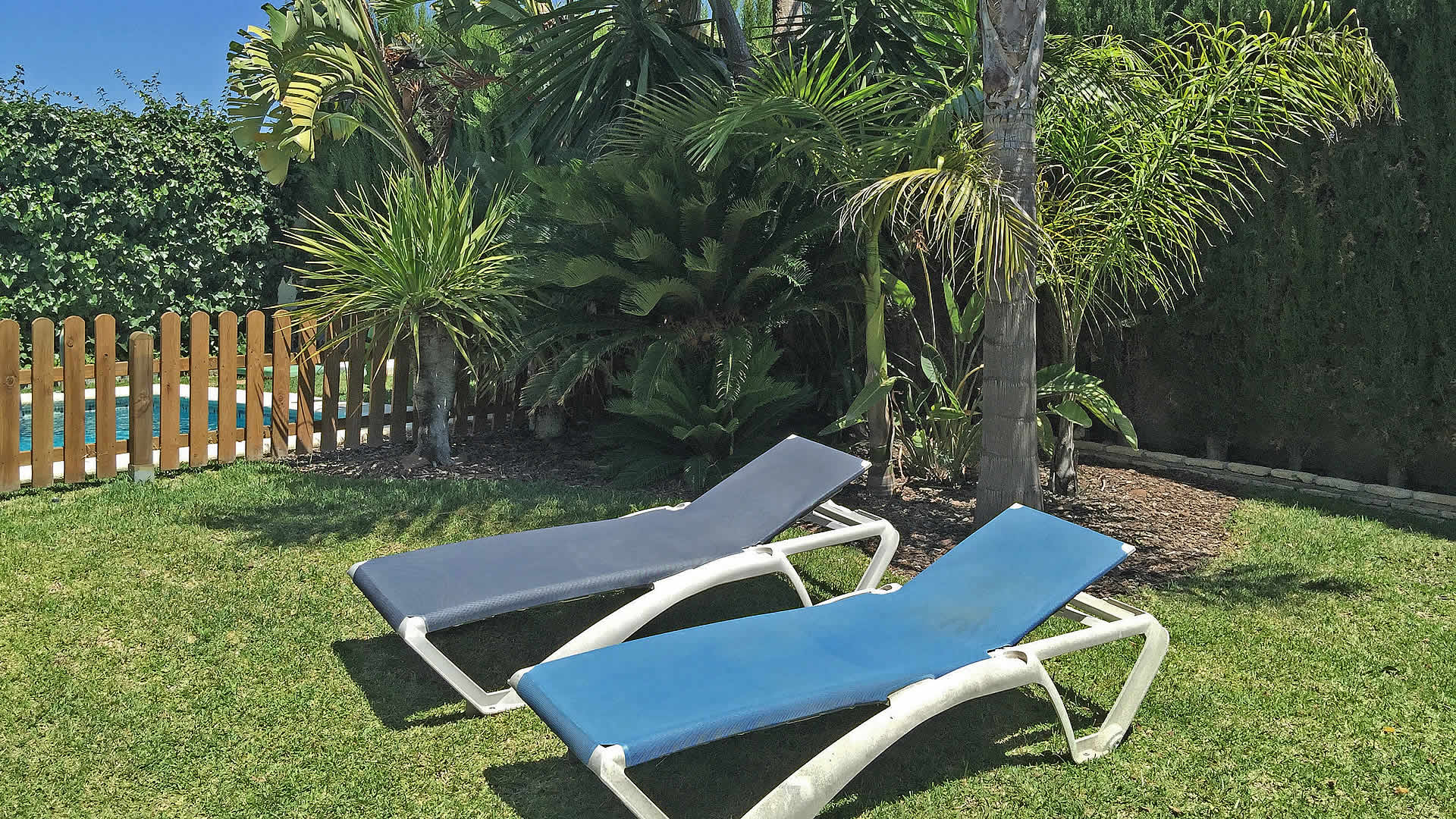 - wunderschöner Garten mit Rasen und Gartenmöbel mit Sonnenliegen