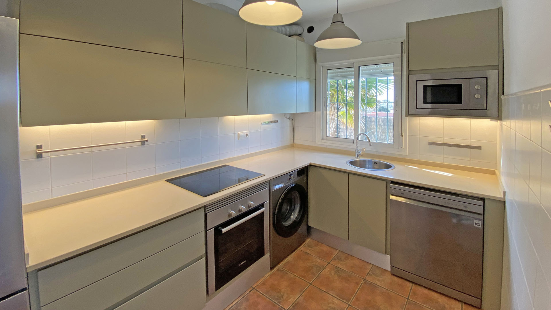 - Küche mit Elektroherd, Elektroofen, Mikrowelle, Geschirrspülmaschine, Kühl-Gefrierkombination, Kaffeemaschine, Wasserkocher, Mixer, Toaster und Entsafter