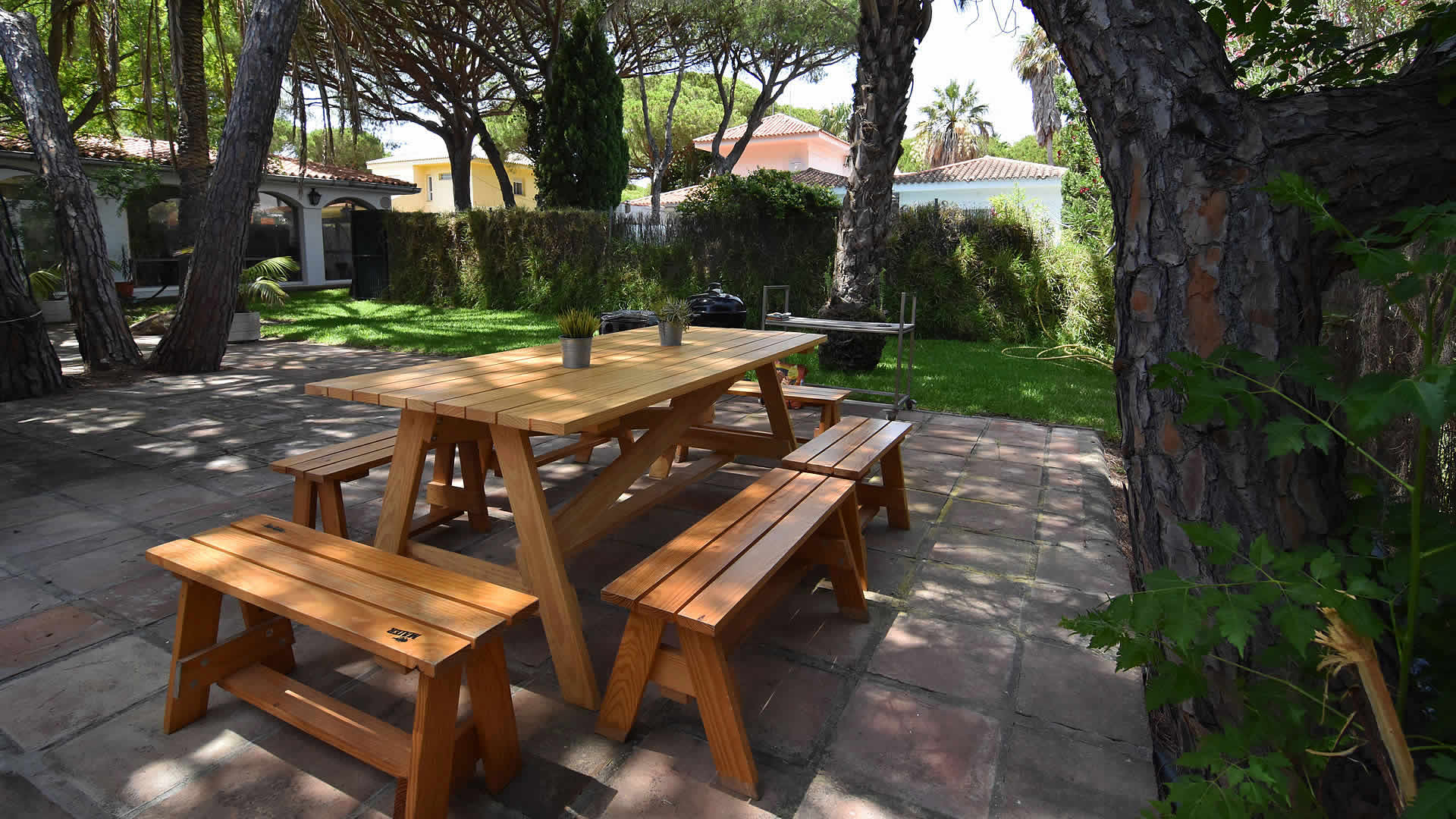 Was kann man sich für seine Ferien noch mehr wünschen? Einen gewaltigen Garten von 1400m2, ein attraktives eigenes Schwimmbecken und zwei Terrassen, eine davon mit Sonne, und die andere mit Schatten. Für das Speisen unter freiem Himmel ist ein Grill vorhanden, wie auch Gartenmöbel und zwei Liegestühle. In der ruhigen Umgebung gibt es die Möglichkeit, Tennis oder Volleyball zu spielen, oder sich in den Fluten der schönen Strände zu erfrischen, die auf Laufabstand (600 Meter) liegen. Kurzum: Alle Zutaten für perfekte, entspannte Ferien! Supermarkt, Restaurant, Bar und Zeitungskiosk liegen nur 5 Gehminuten entfernt, weitere (Einkaufs-)Möglichkeiten finden Sie im Zentrum von Conil de la Frontera selbst, nur eine Viertelstunde mit dem Auto entfernt (7 Kilometer). Von hier aus lassen sich auch bequem einige der Sehenswürdigkeiten Andalusiens entdecken, wie die Stadt Jerez de la Frontera mit ihren berühmten Sherry-Weinkellern, die fantastische andalusische Pferdeshow, oder Sie gehen auf eine Besichtigungstour der "weißen Dörfer" wobei Sie am besten in der antiken Stadt Arcos de la Frontera beginnen. Außerdem (falls Sie sich überhaupt noch weiter von diesem idyllischen Ort entfernen wollen) bietet sich ein Besuch von Sevilla an, jener Stadt, in der das bezaubernde Maurische Erbe dieses Teils von Spanien am besten bewahrt geblieben ist.