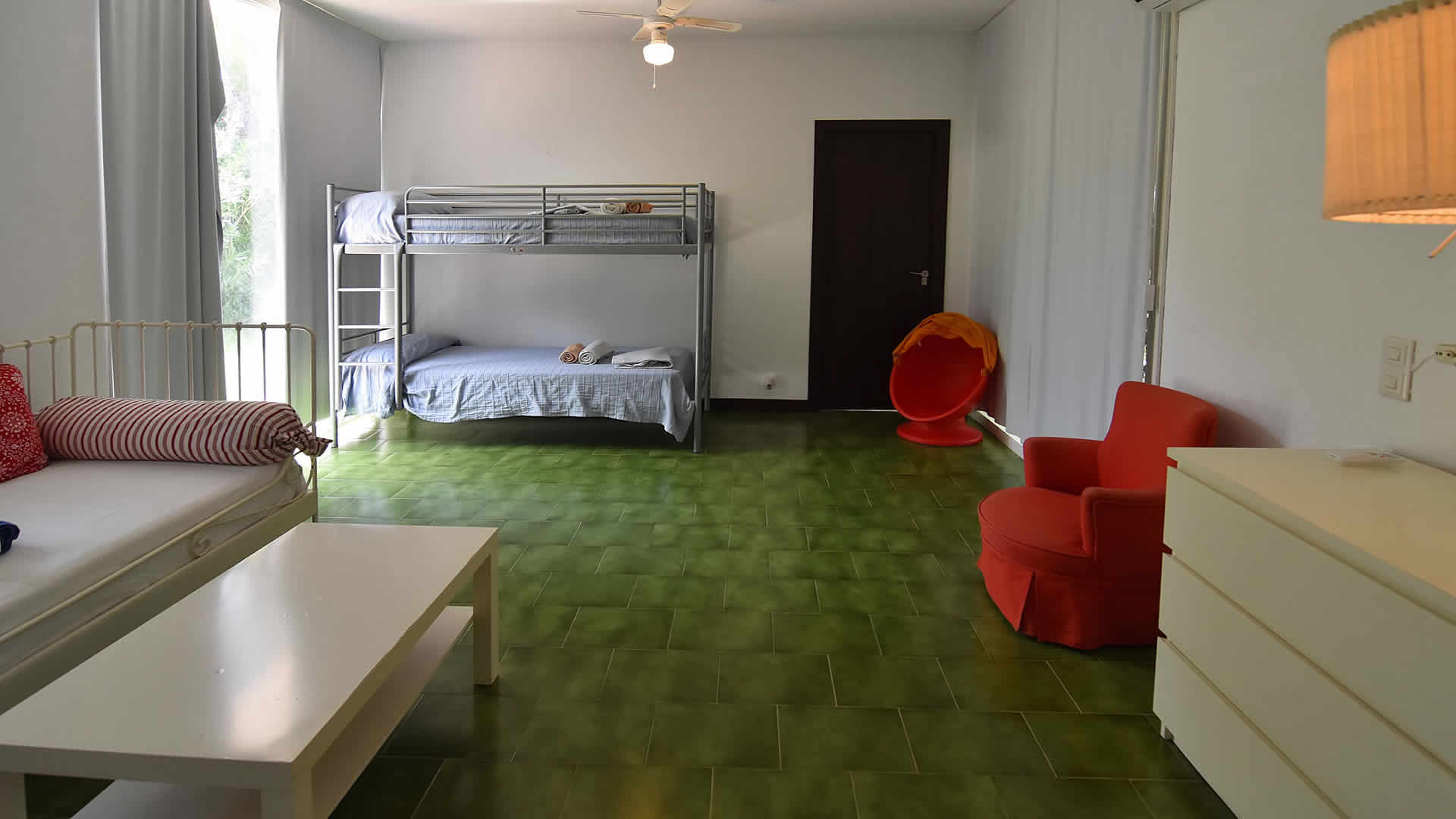 Das APPARTEMENT verfügt über 1 Schlafzimmer mit Doppelbetten und 1 Zimmer mit zwei Hochbetten die ein WC teilen. Achtung: der Zugang zum zweiten Schlaffzimmer erfolgt durch das andere Zimmer. Deshalb eignet sich dieses Appartement am meisten für z.B. zwei Erwachsene mit zwei Kindern.