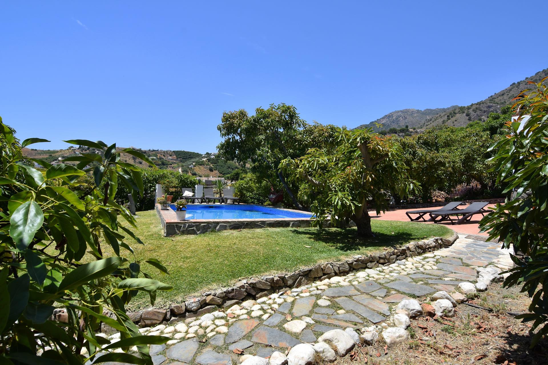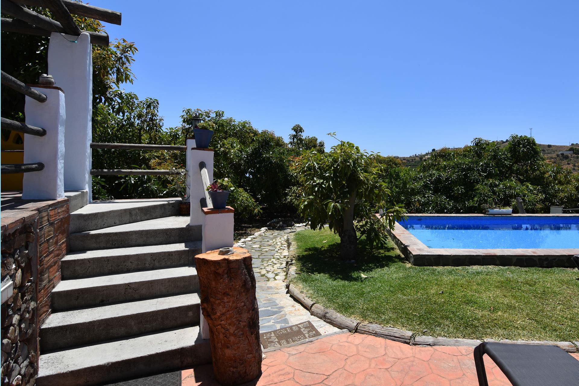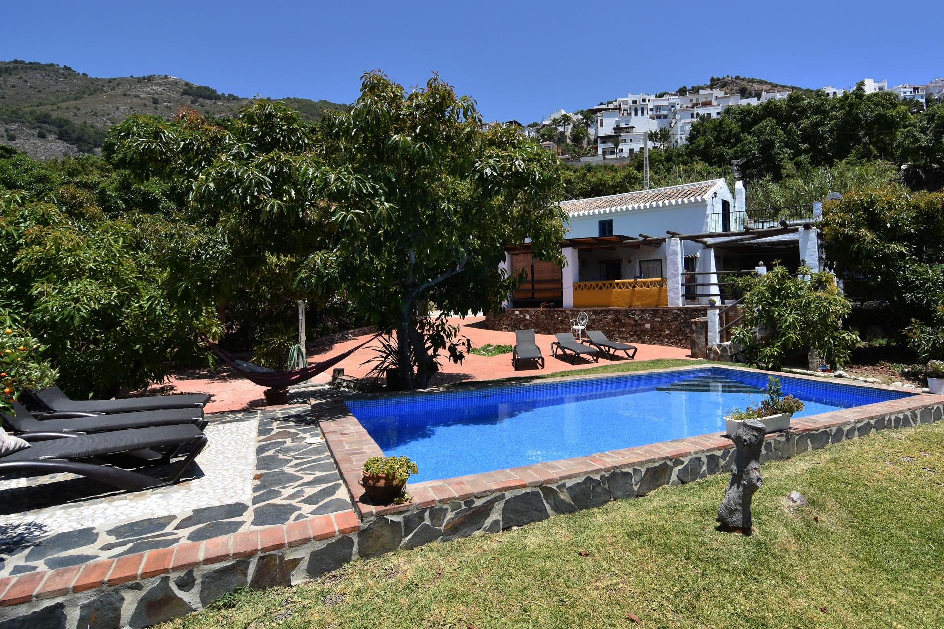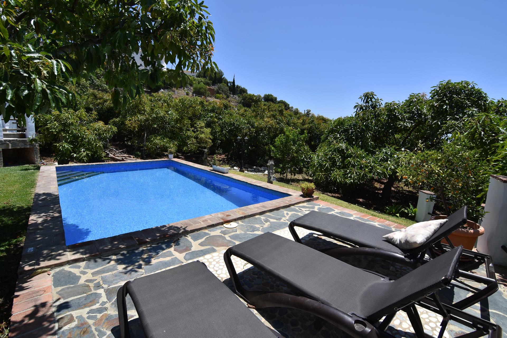 Die Anlage hat einen großen Swimmingpool (4x7,5 m lang und 1x1,5 m tief) mit Rasenfläche und einer hübschen Sonnenterrasse — zur Entspannung einladende Sonnenliegen sind vorhanden. Von hier aus gelangt man auch verhältnismäßig schnell zu den eindrucksvollen andalusischen Städten arabischen Ursprungs wie Granada, Sevilla und Cordoba. Und zu den Stränden von Nerja sind es nur 10 Minuten Autofahrt.