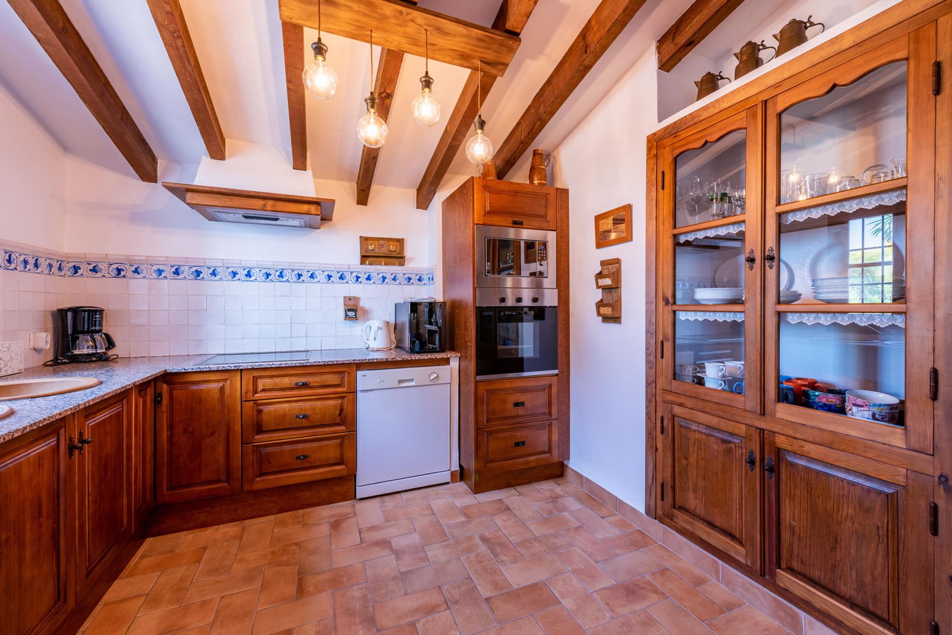 Die Räume befinden sich alle zu ebener Erde, sind sehr geschmackvoll eingerichtet und in einem rustikalen andalusischen Stil gehalten. Der offene Wohnbereich geht in eine geräumige Küche über, die eine flache Stufe höher liegt. Der Wohnbereich hat ein Fernsehgerät, eine Musikanlage und einen Holzbrennofen, der im Winter für Wärme sorgt. Die Decken sind im gesamten Haus sehr hoch und vermitteln an heißen Sommertagen ein Gefühl von Geräumigkeit und Frische. Großzügige Fenster und Terrassentüren (mit eingebautem Moskitonetz) gehen auf die Veranda hinaus. Die vollständig ausgestattete Küche verfügt über ein Ceranfeld, Backofen, Mikrowelle, Geschirrspüler, Kühl-/Gefrierschrank, Wein Kühlschrank und Kaffeemachine (2 Typen). Die Waschmaschine steht in einem Wirtschaftsraum. Das Haus hat zwei Schlafzimmer (1 Zimmer mit Doppelbett, das andere mit zwei Einzelbetten) und einen Duschraum mit WC und Waschbecken.