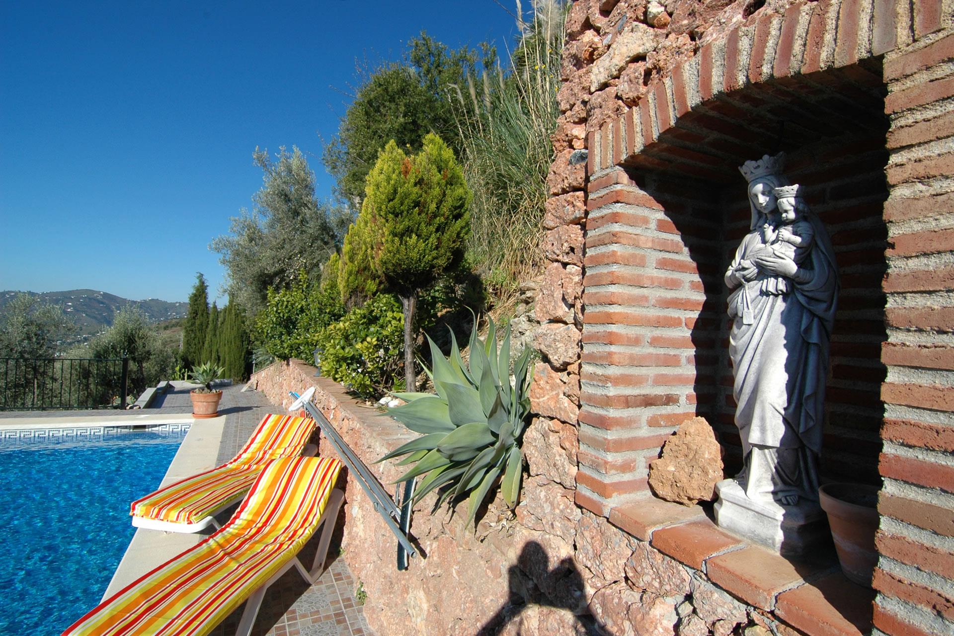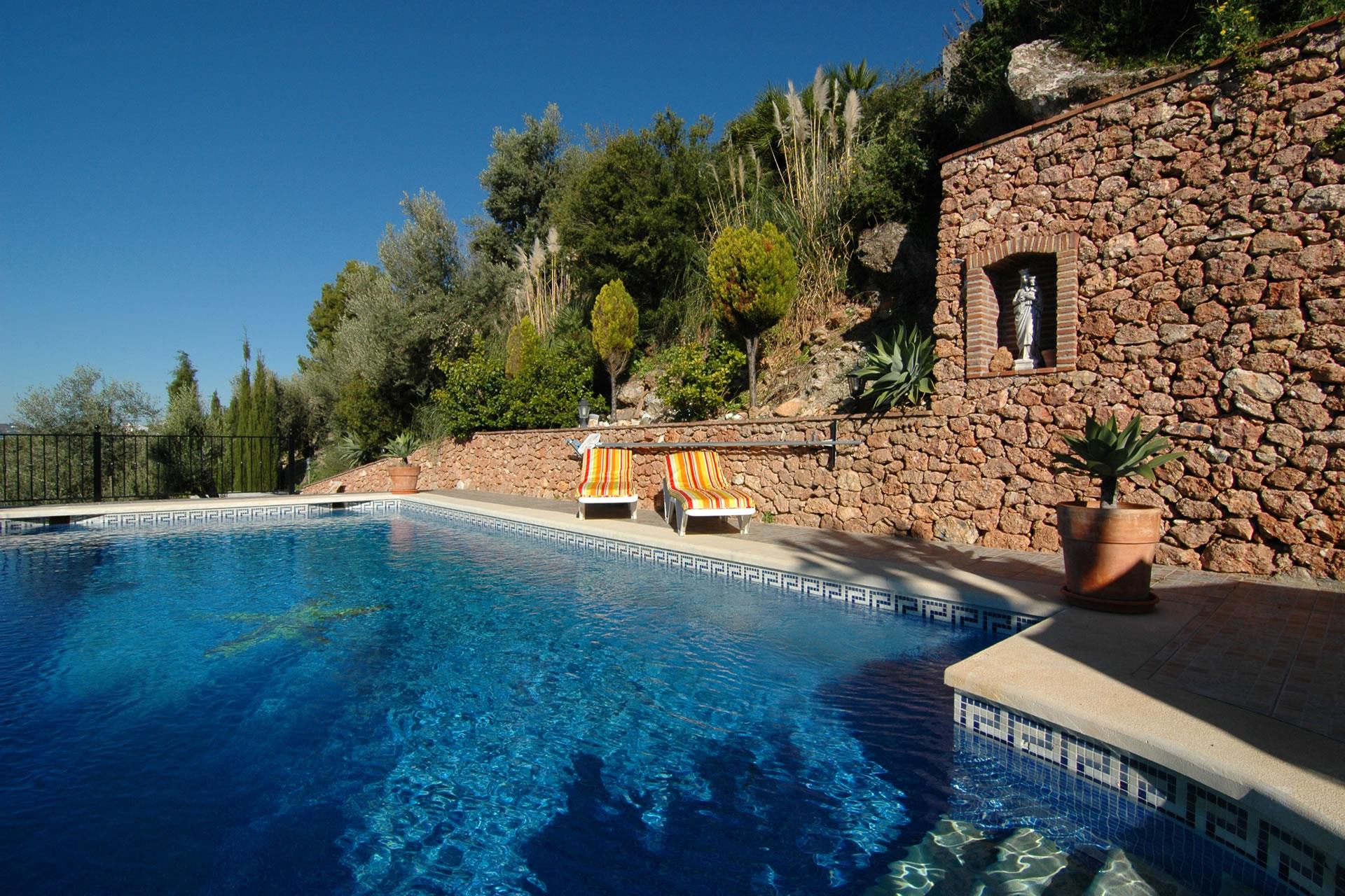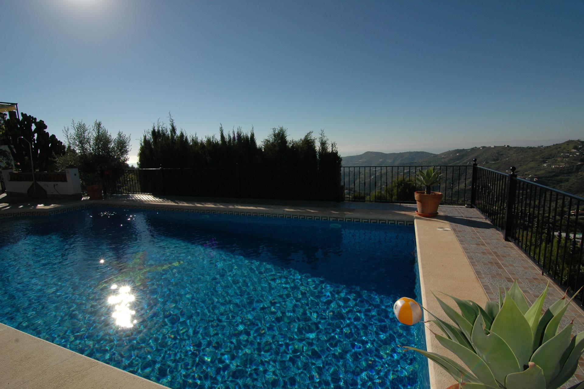 Diese schöne Doppelhaus-Villa ist über eine kurvige, befestigte Landstraße zu erreichen, und doch sind es weniger als 10 Autominuten bis nach Frigiliana (4,0 km) und nur 20 Minuten bis zur Küste von Nerja und deren Sandstrände (11 km). Bei der Ankunft wird Ihr Auge unweigerlich von der herrlichen Aussicht über die umliegende Landschaft bis hinunter zum Mittelmeer angezogen. Die Anlage hat mehrere große Terrassen und Sitzecken, während der Pool von einem Garten voller Blumen, Pflanzen, Sträuchern und Bäumen umgeben ist. Der private Pool im römischen Stil befindet sich in einem umzäunten Bereich, um Sicherheit für Kinder zu garantieren, und hat bemerkenswerte Ausmaße: 10m x 5m und 1m bis 2,50m tief. Der Grillplatz ist mit Gartenmöbeln ausgestattet und der richtige Ort, um Ihre Gäste abends bei einer kühlen Sangria unter dem Sternenhimmel zu bewirten. Auf der Pool-Terrasse verfügen Sie über eine Dusche im Freien.