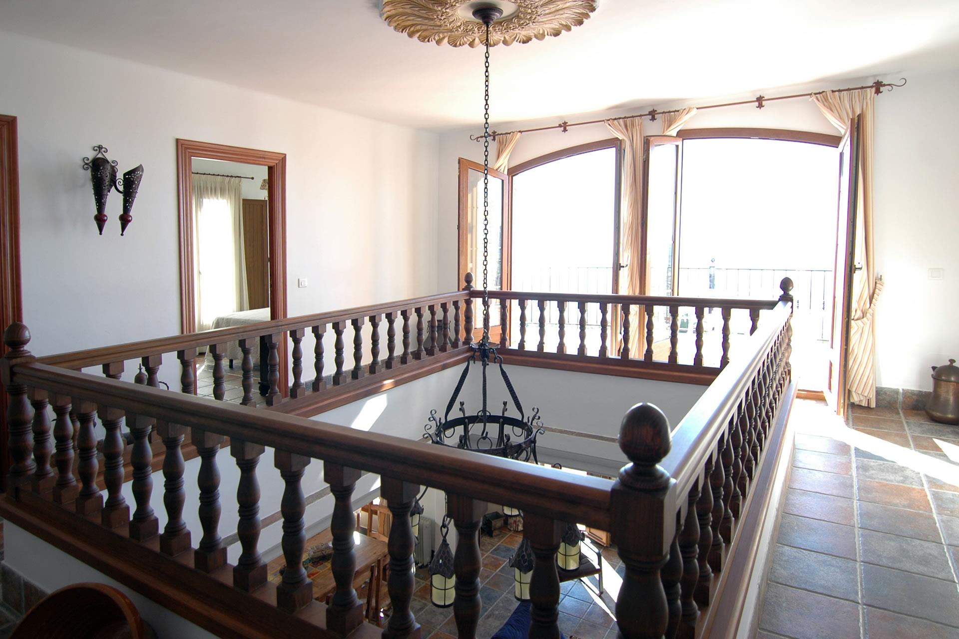 Vom Wohnzimmer führt eine Treppe auf eine Galerie mit Blick auf den offenen Wohnraum unten. Es gibt 4 Doppelzimmer, von denen 2 Zugang zu einer Terrasse mit herrlichem Blick haben. Die Schlafzimmer teilen sich ein komplettes Badezimmer mit Kopfbrause, WC und Einzelwaschbecken ebenso wie ein Duschbad mit WC und Einzelwaschbecken.