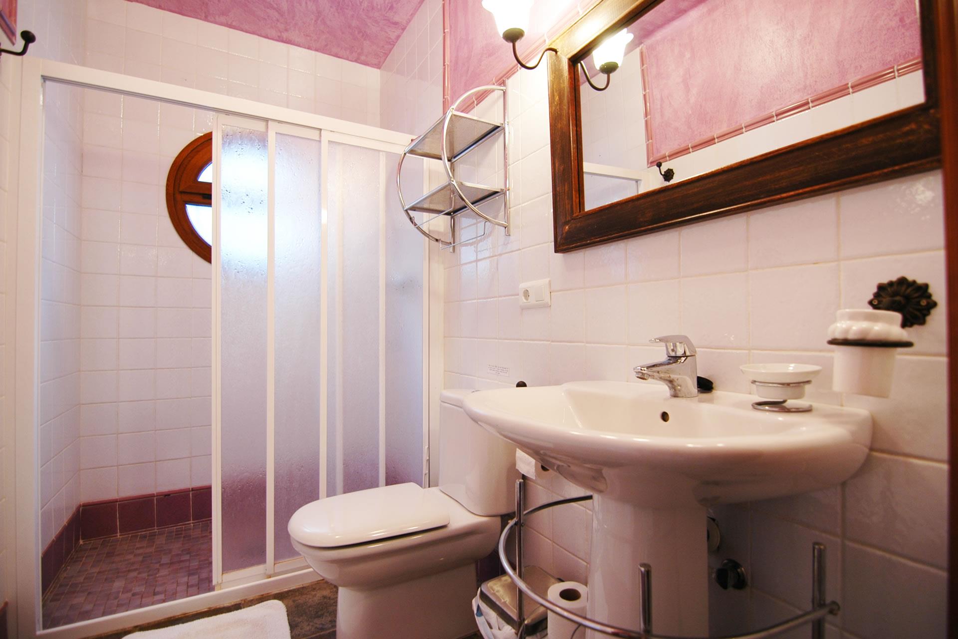- Badezimmer mit Einzelwaschbecken, Dusche und Toilette