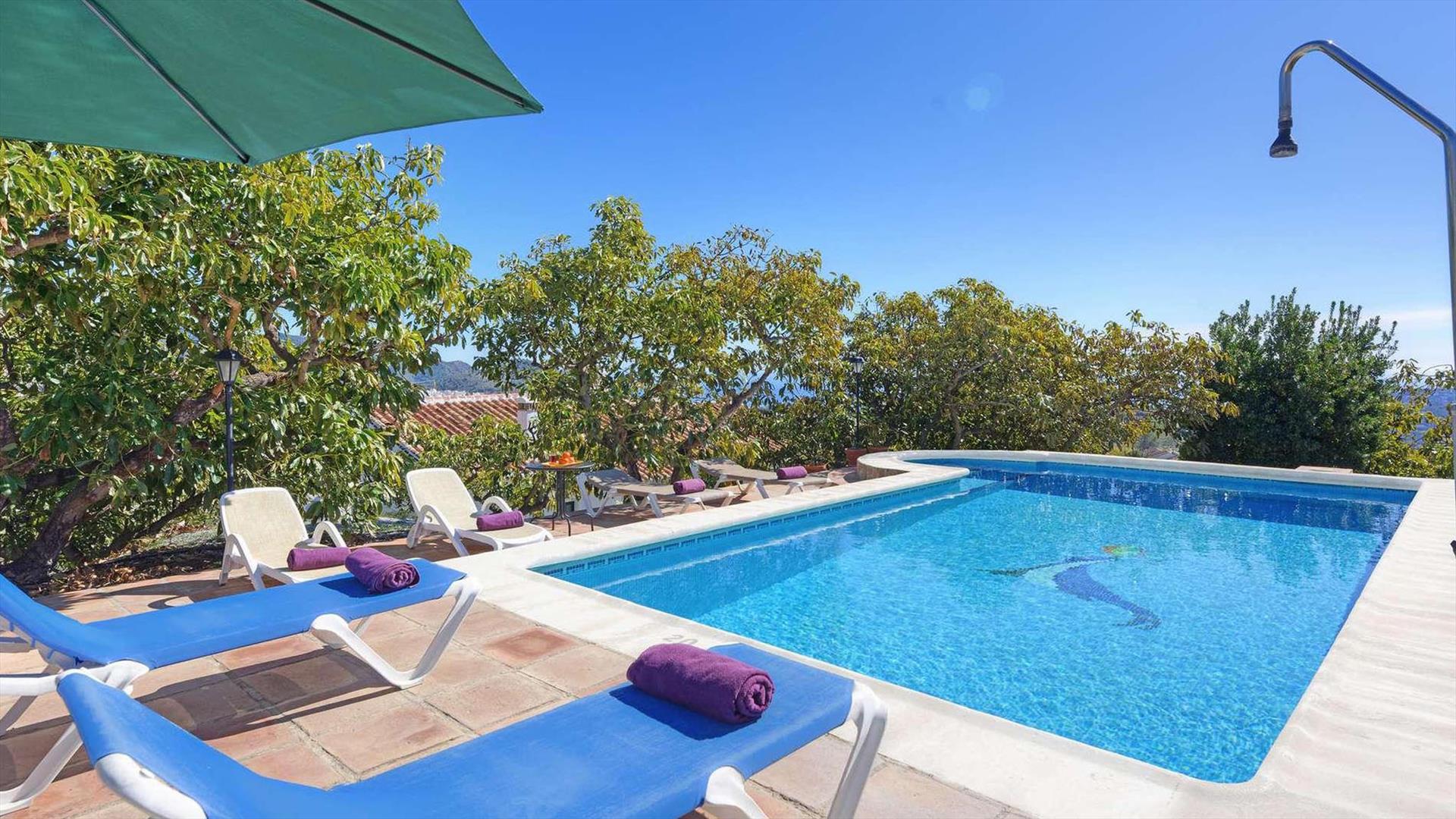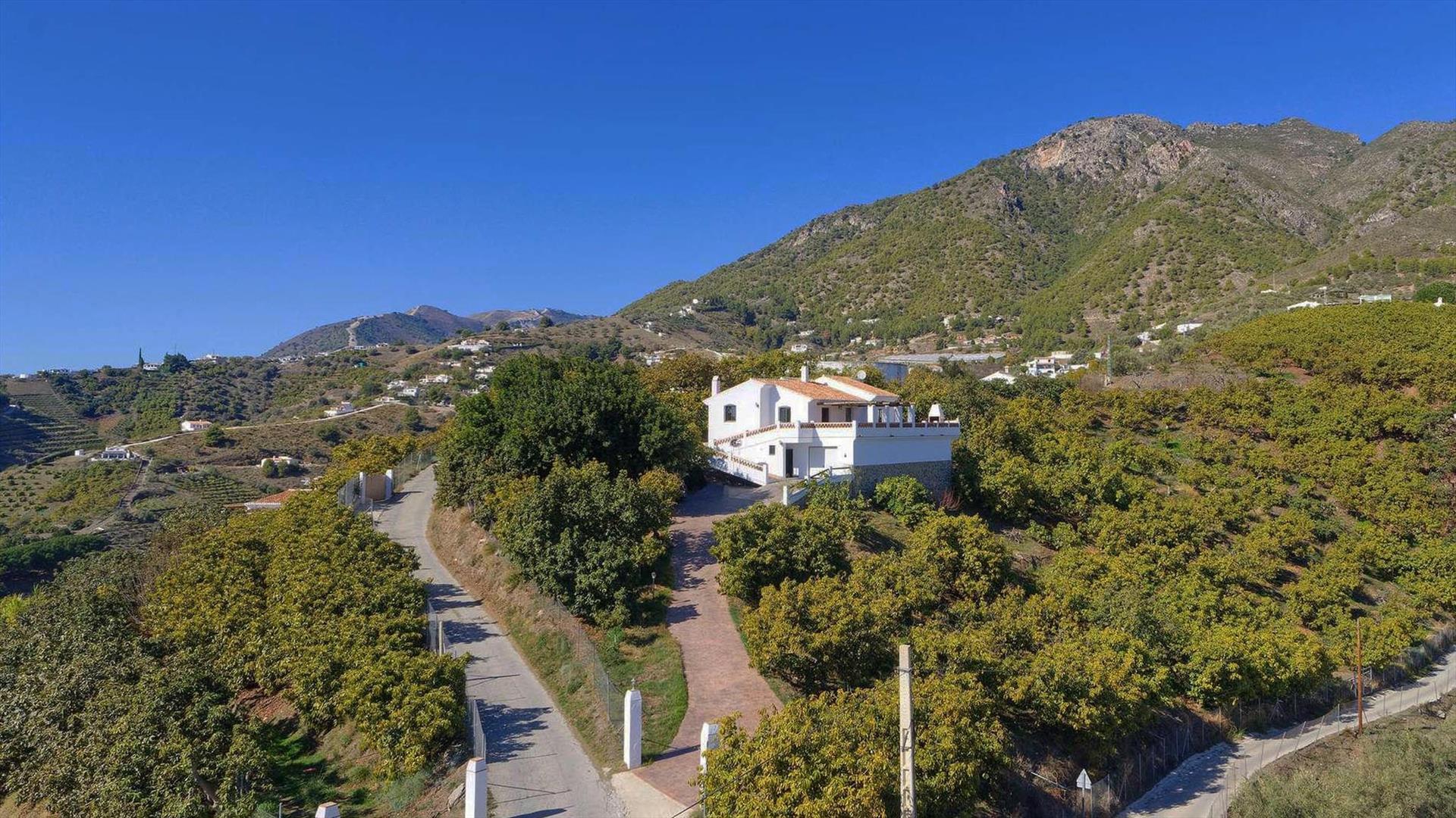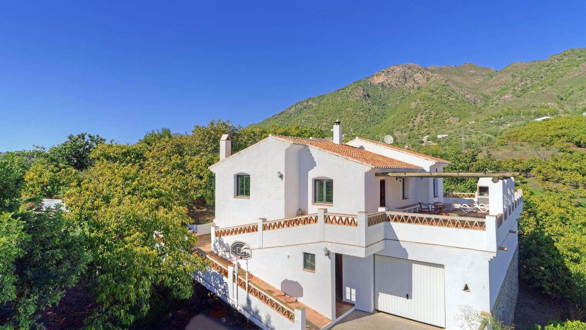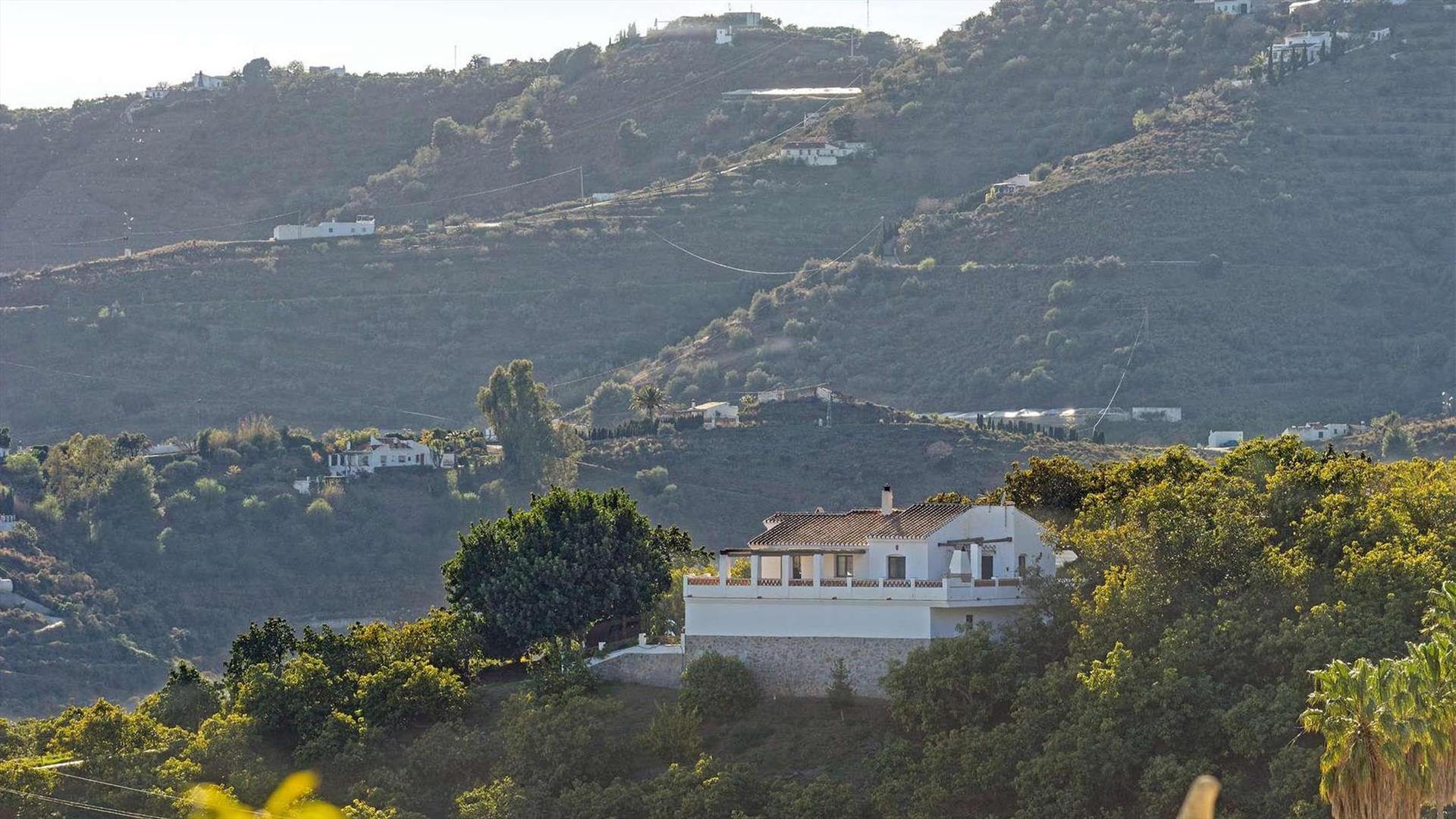Dieses Haus ist eine Oase der Stille, wird von Avocadoplantagen umgeben und liegt nur 5 Autominuten von dem Ort Frigiliana (1.2 Km) entfernt. Sie können das Dorf zudem in 15 Minuten zu Fuß über eine Abkürzung erreichen. Die herrlichen Strände von Nerja (7 Km) erreichen Sie nach 15 Autominuten. In der Nähe befindet sich auch ein schönes Restaurant, welches Sie bequem nach 5 Minuten Fußweg besuchen können. Die Villa ist für Urlauber ideal gelegen, die die Ruhe eines idyllischen Rückzugsorts mit ein paar Tagen am Strand und dem Entdecken andalusischer Schätze kombinieren möchten. Die Frontterrasse wird von Schatten spendenden Bambushölzern überdacht und stellt den perfekten Ort für Ihre Mahlzeiten im Freien dar - ein Grill ist vorhanden. Von dort aus können Sie zudem eine weit reichende Aussicht auf die umgebenden Hügel bis hin zum Mittelmeer genießen. Der attraktive private Pool (10 x 5 Meter) liegt direkt hinter dem Haus auf einer höher gelegenen Ebene (Zugang durch eine Treppe). Hier sind Sie absolut ungestört. Sonnenliegen, Sonnenschirme und Gartenmobiliar befinden sich auf der das Haus umgebenden Terrasse sowie auf der Poolterrasse. Die Villa verfügt über eine eigene Auffahrt und hinreichende Parkmöglichkeiten. Zu dem Grundstück gelangt man über einen zementierten Geländeweg.