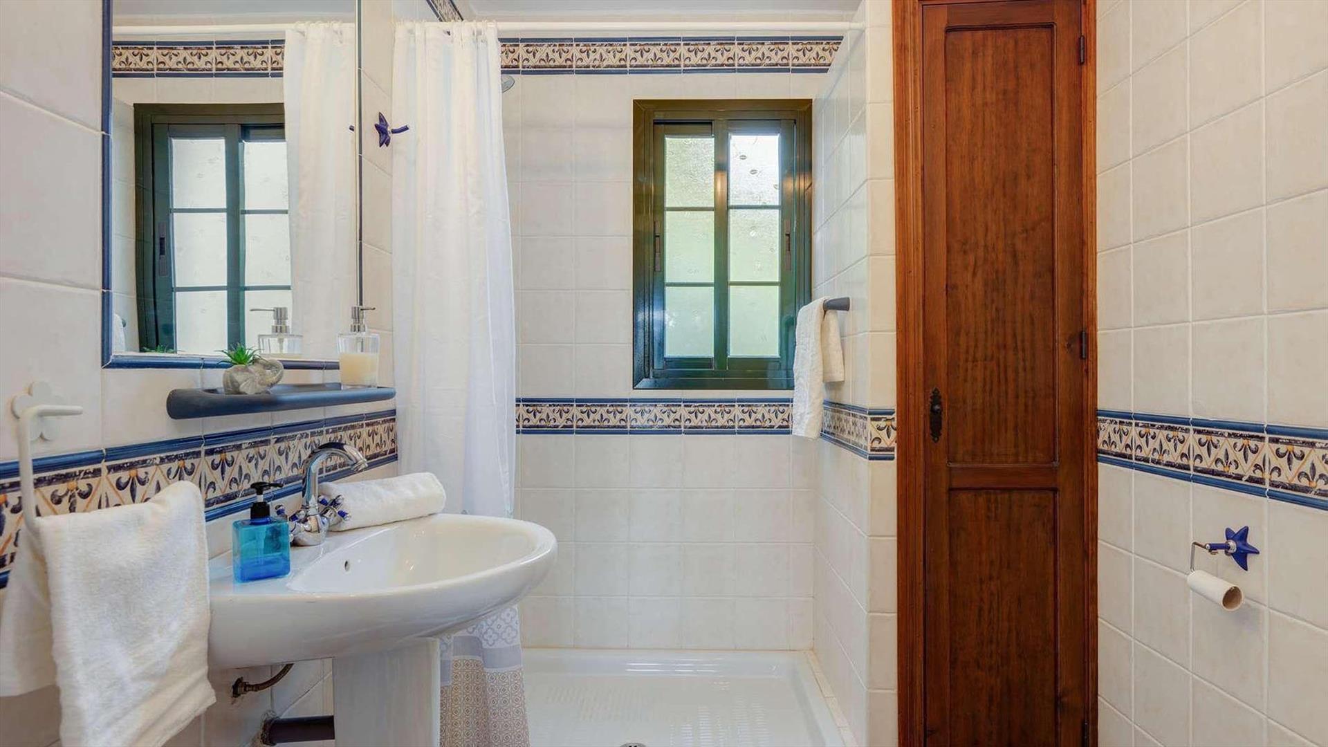• Badezimmer mit Einzelwaschbecken, Dusche und Toilette