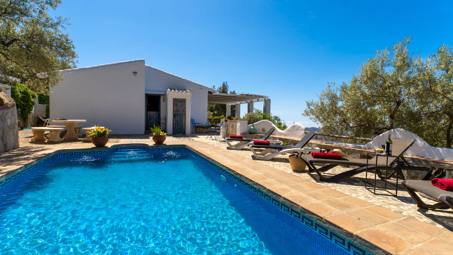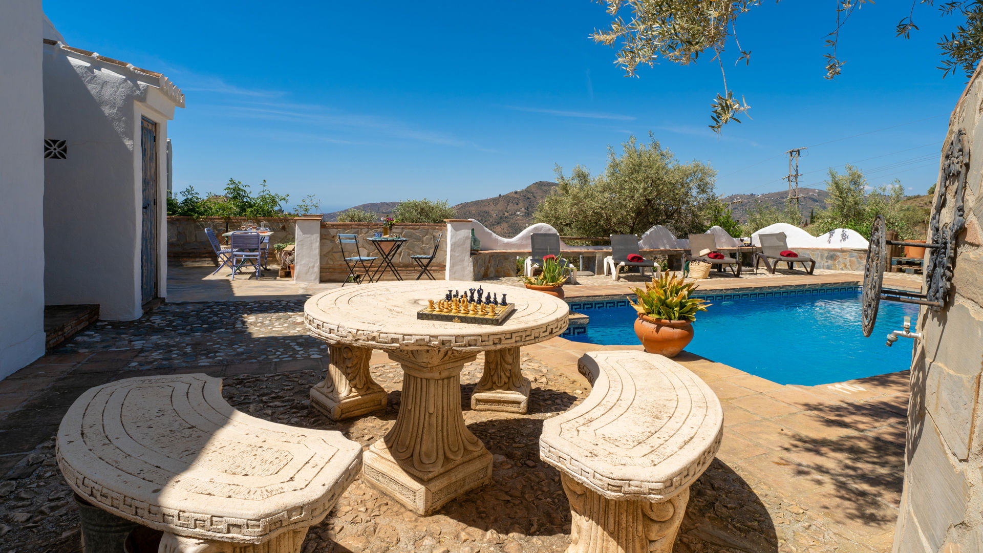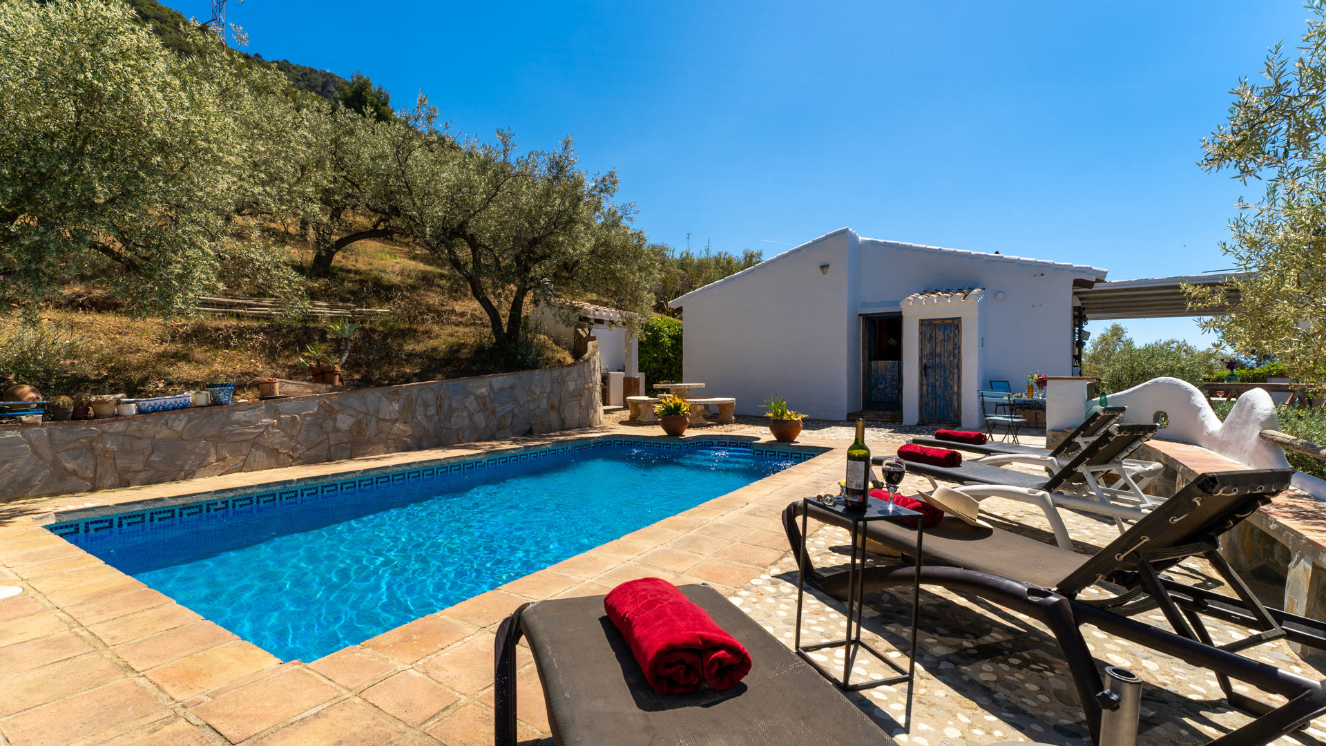 Das Häuschen hat eine sehr ruhige und sehr günstige Lage: 7 Autominuten von Frigliana entfernt und bis Nerja und den Stränden der Costa del Sol sind es nur 10 bis 15 Minuten Autofahrt. Málaga erreicht man mit dem Auto in knapp einer Stunde und Granada in nur 90 Minuten. Ebenso leicht gelangt man in die wunderbaren historischen Städte Córdoba, Sevilla und Ronda.