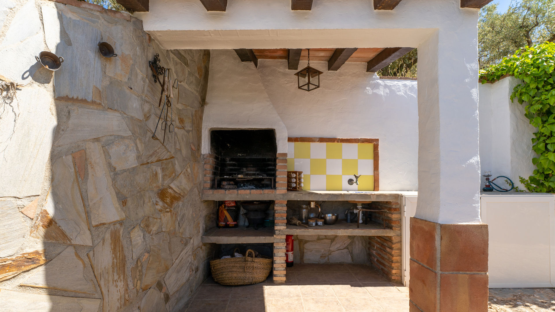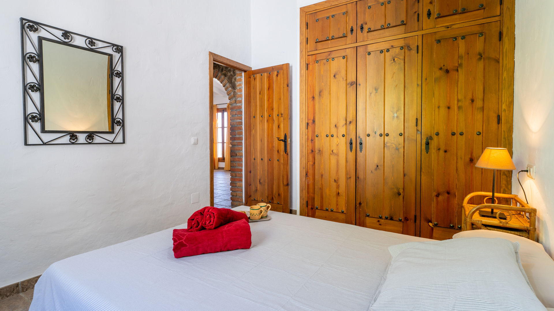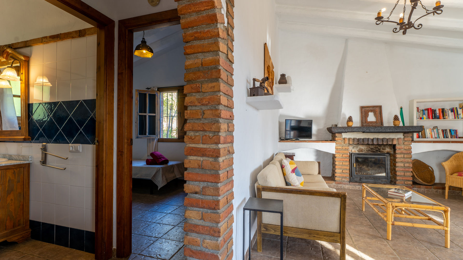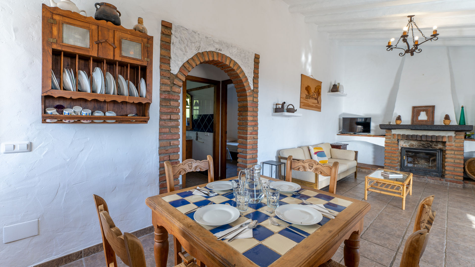 Das Häuschen verbindet ein friedvolles und romantisches Ambiente mit sehr andalusischen Elementen wie Holzbalkendecke, traditionelle Ziegelsteine, handgemachte Kacheln und weißgetünchte Wände. Der offen angelegte Wohnbereich befindet sich im gleichen Raum wie die Küche und die Essecke. Die Sitzecke hat zwei Sofas, einen geschlossenen Kamin, ein Radio/Kassetten/CD-Player und Satelliten-Fernsehen. Die komplett ausgestattete Küche besitzt ein 4-Ring-Ceramfeld, einen elektrischen Backofen, Kühlschrank mit Gefrierfach, Mikrowelle und eine Waschmaschine. Das Haus hat ein Schlafzimmer mit Doppelbett und eines mit zwei Einzelbetten. In beiden bilden die ockerfarbenen Decken einen hübschen Kontrast zu den weißgetünchten Wänden. Das Badezimmer liegt zwischen diesen beiden Zimmern und ist mit Badewanne mit Duschkopf, WC und Waschbecken ausgestattet.