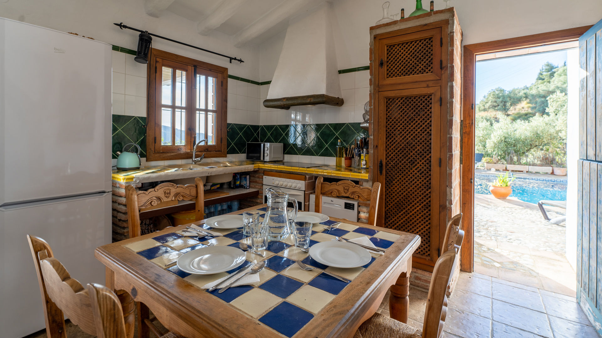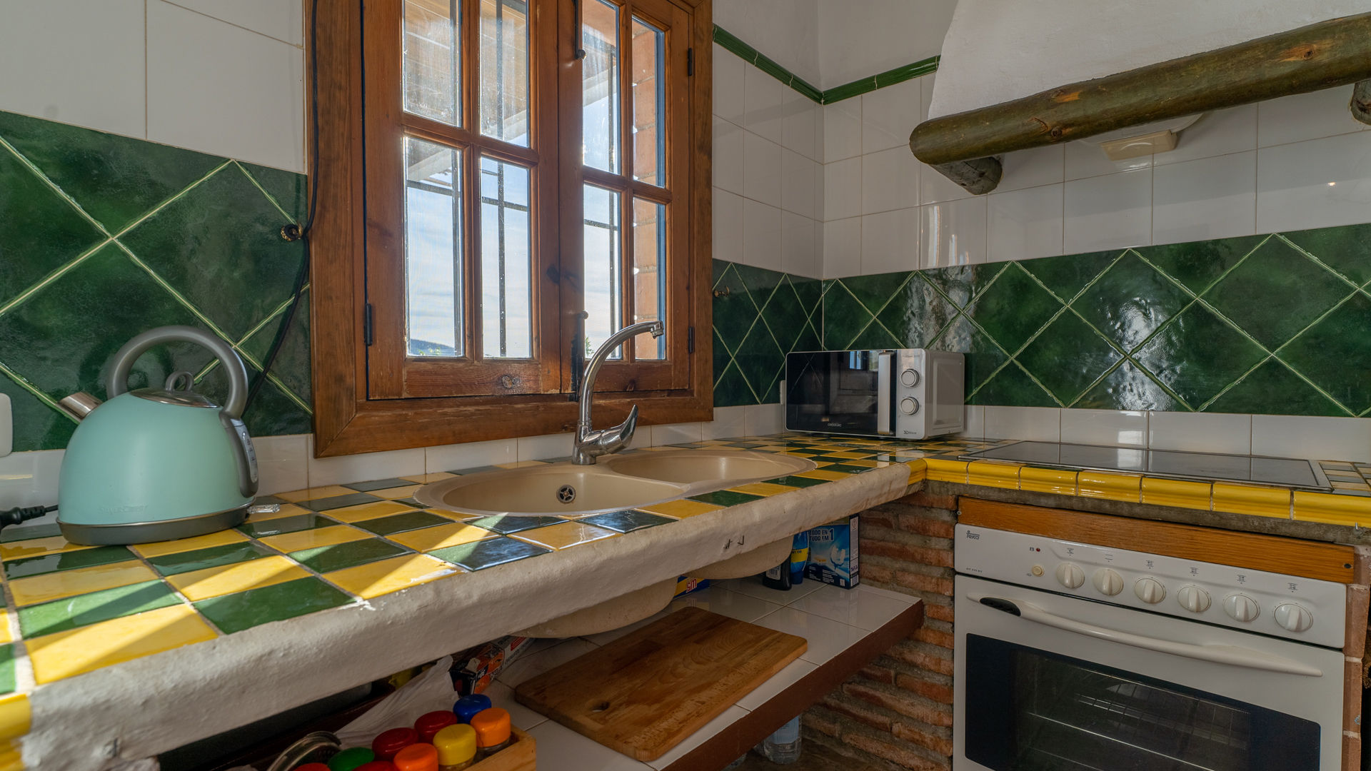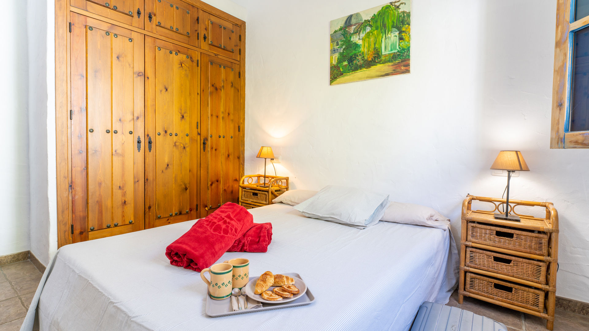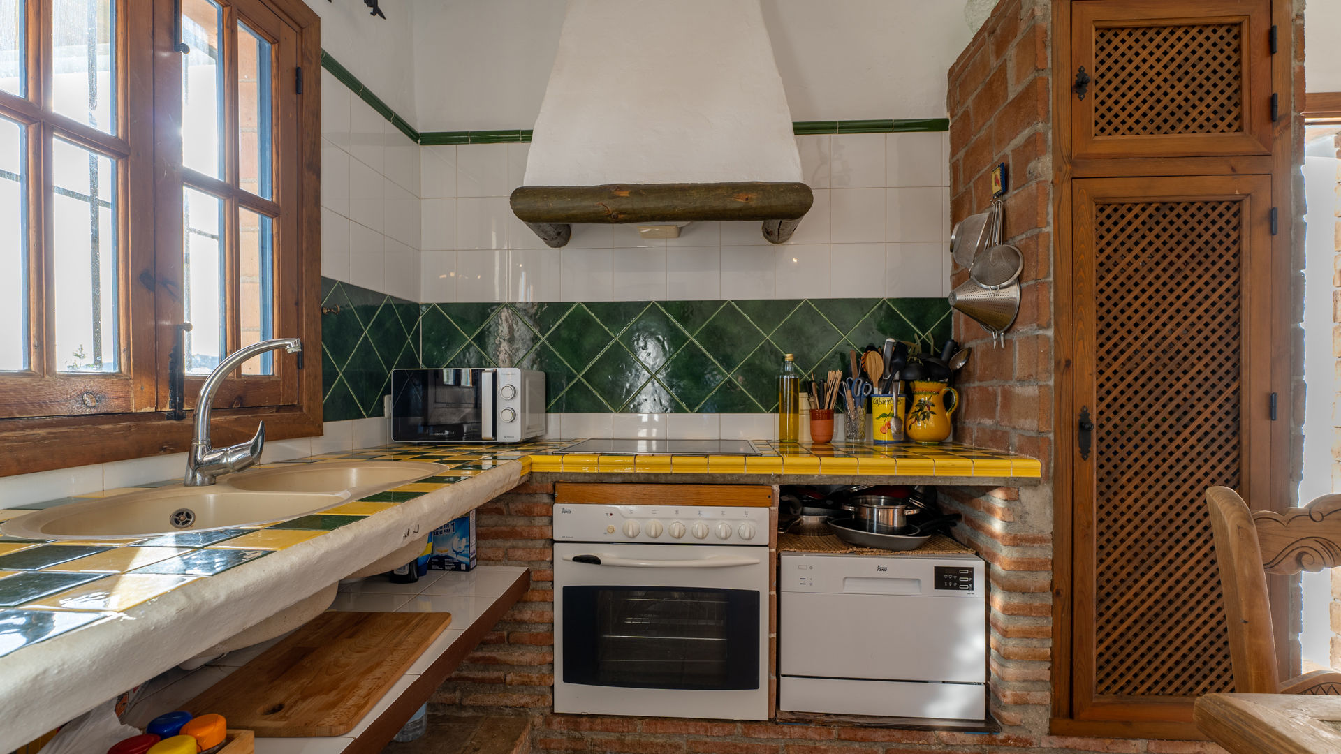 Das Häuschen verbindet ein friedvolles und romantisches Ambiente mit sehr andalusischen Elementen wie Holzbalkendecke, traditionelle Ziegelsteine, handgemachte Kacheln und weißgetünchte Wände. Der offen angelegte Wohnbereich befindet sich im gleichen Raum wie die Küche und die Essecke. Die Sitzecke hat zwei Sofas, einen geschlossenen Kamin, ein Radio/Kassetten/CD-Player und Satelliten-Fernsehen. Die komplett ausgestattete Küche besitzt ein 4-Ring-Ceramfeld, einen elektrischen Backofen, Kühlschrank mit Gefrierfach, Mikrowelle und eine Waschmaschine. Das Haus hat ein Schlafzimmer mit Doppelbett und eines mit zwei Einzelbetten. In beiden bilden die ockerfarbenen Decken einen hübschen Kontrast zu den weißgetünchten Wänden. Das Badezimmer liegt zwischen diesen beiden Zimmern und ist mit Badewanne mit Duschkopf, WC und Waschbecken ausgestattet.
