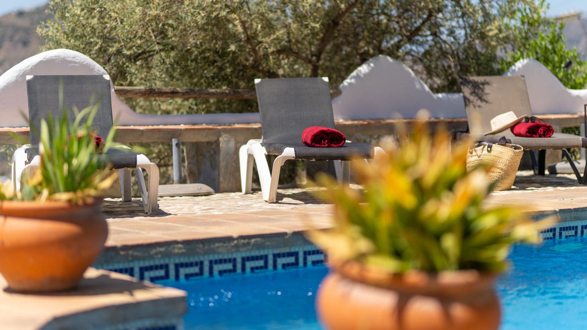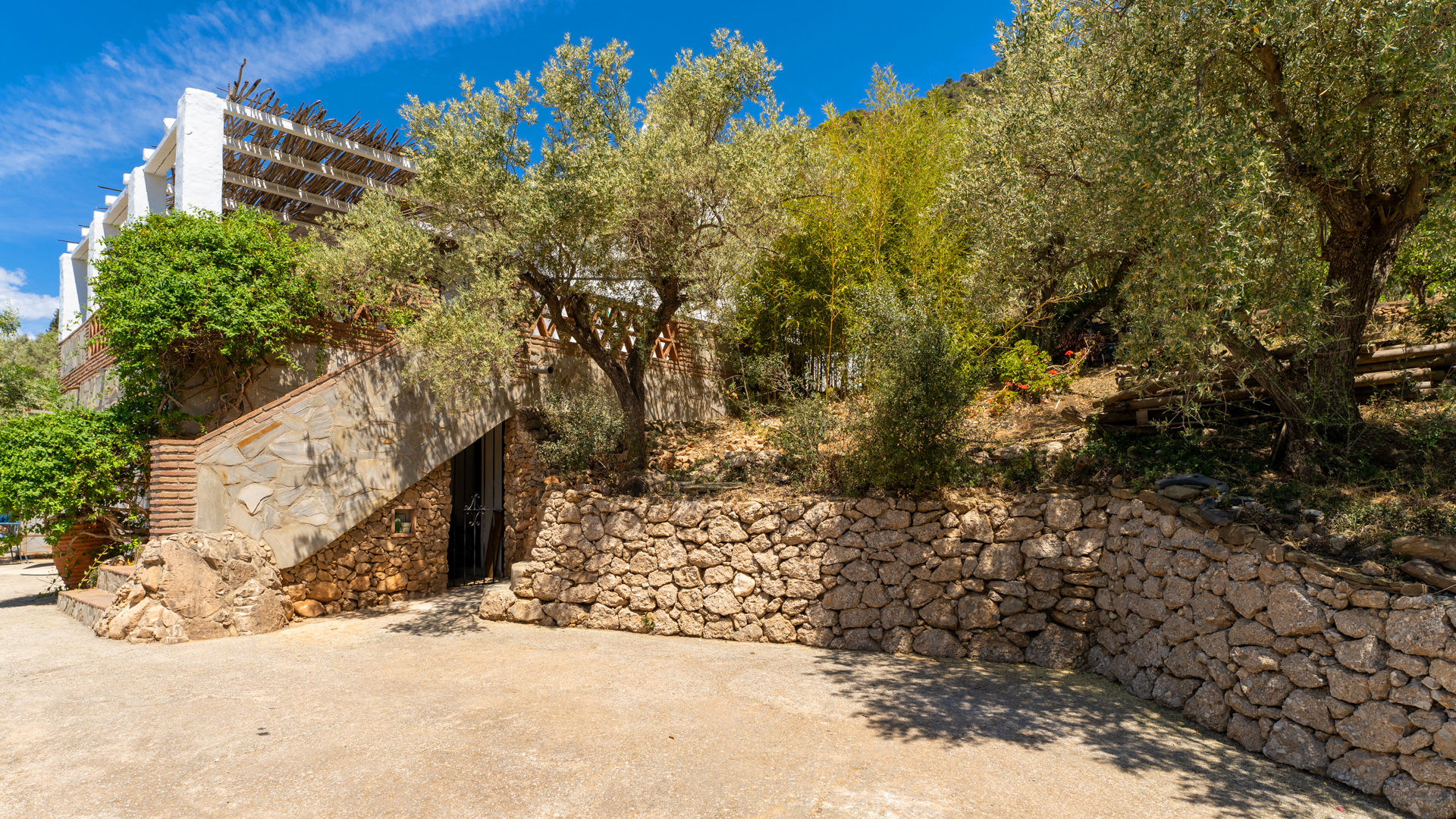 Wie auf den Fotos zu sehen ist, liegt das Häuschen inmitten eines Olivenhains. Zu ihm gelangt man über ein paar Stufen vom darunter liegenden Parkplatz aus. Von der großartigen Veranda mit dem überwältigenden Ausblick tritt man in das Wohnzimmer. Nur ein paar Schritte durch die Küche und Sie befinden sich neben dem Swimmingpool, der vollkommen sichtgeschützt ist. Auch hier haben Sie ein liebliches traditionelles Ambiente, mit einer Terrasse aus Naturstein und Terrakotta-Fliesen, die den Pool (6,6x4.6 m und 1,1 bis 1,5 m tief mit Stufen am flachen Ende) umrahmen. Sonnenliegen sind vorhanden und ein Grill mit Verandamöbel laden zu Mahlzeiten an der frischen Luft ein. Die Pool-Terrasse geht nach Südwesten hinaus und überblickt das Tal und das Meer - ein wunderbarer Platz für Vollmondnächte oder die Betrachtung der Sterne. Für Vogelbeobachter ist es ein wahres Paradies, denn Vögel gibt es hier das ganze Jahr über. An den Hängen oberhalb kann man bisweilen auch wilde Bergziegen sehen.
