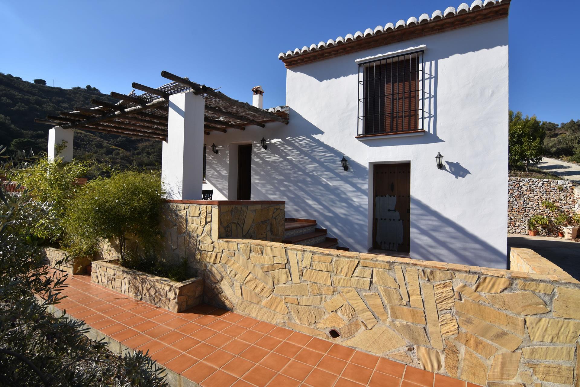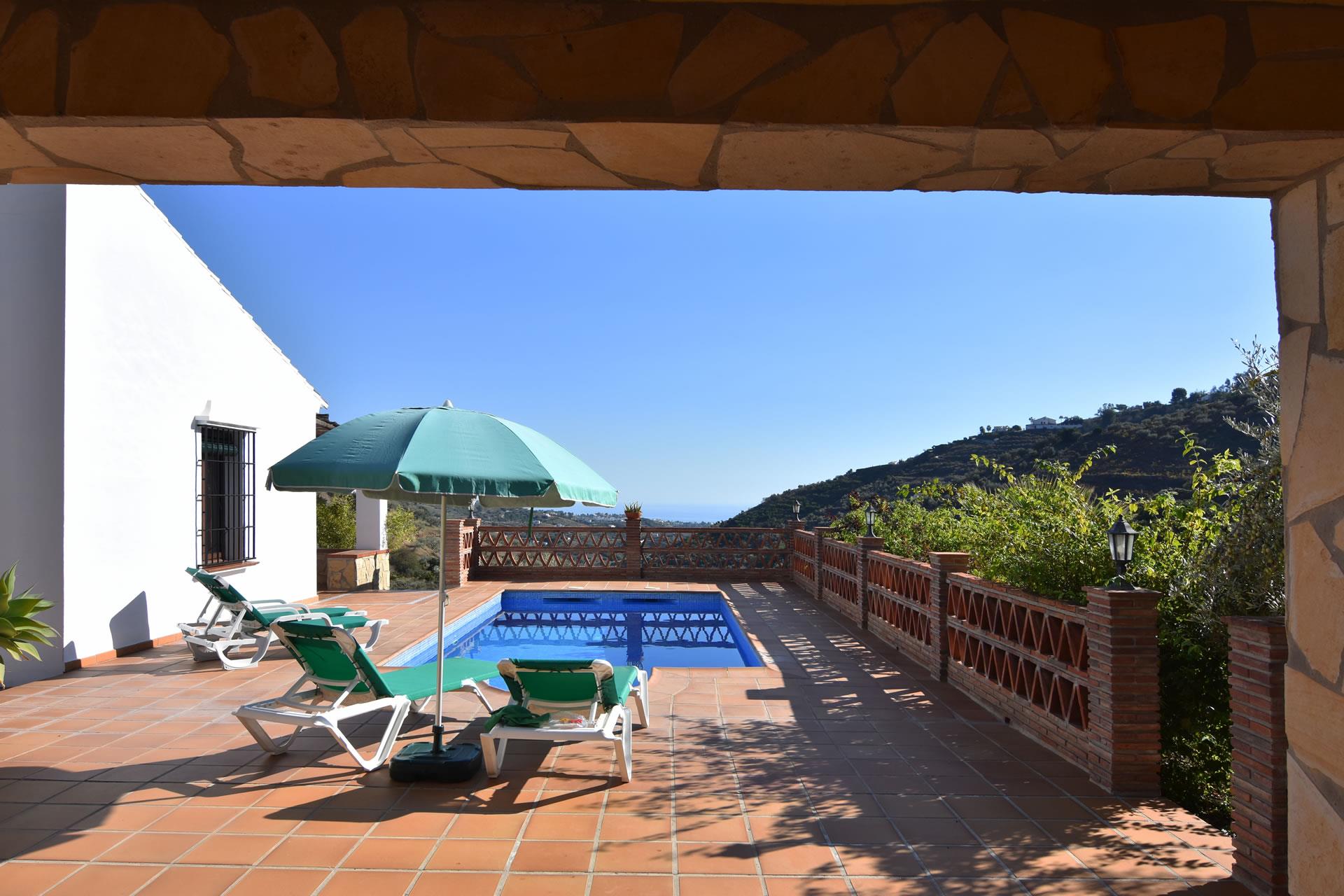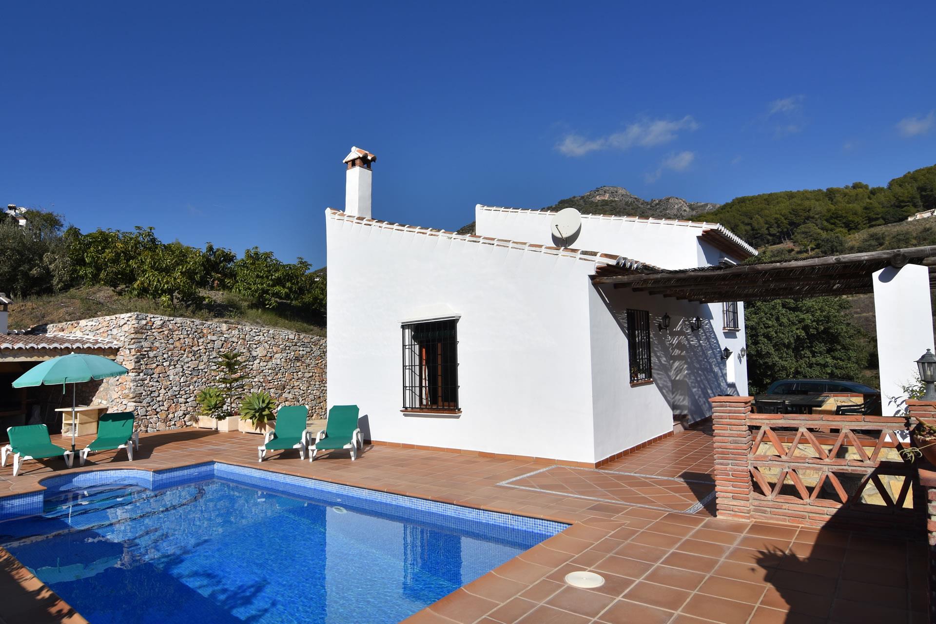 Dieses Ferienhäuschen hat eine einzigartige erhöhte Lage, ist 5,2 Kilometer vom weißgetünchten Frigiliana entfernt und bietet eine unschlagbare Aussicht. Von der Hauptstraße führt eine betonierte 2 km lange Bergstrecke zum Anwesen und verleiht ihm eine private und exklusive Atmosphäre. Die letzten 400m sind unbefestigt, können aber problemlos mit einem normalen Auto befahren werden. Für diejenigen, die ein Bad im Meer nehmen oder die ausgezeichneten Paellas im Burriana Playa probieren möchten, stehen in nur 20 Autominuten entfernt die Strände von Nerja (12 km) zur Verfügung. Das Haus verfügt über eine geräumige und schattige Vorderterrasse mit Gartenmöbeln und eine einladende Sonnenterrasse mit eigenem Pool (7 m x 3,5 m und 1,5 m - 1,9 m tief). Sonnenliegen sind vorhanden. Angrenzend an die Sonnenterrasse finden Sie einen herrlichen gemauerten Grillplatz. Die umliegende Landschaft bietet hervorragende Möglichkeiten für schöne Spaziergänge entlang der Avocado-, Mango- und Olivenhaine und für Bergwanderungen weiter im Norden.