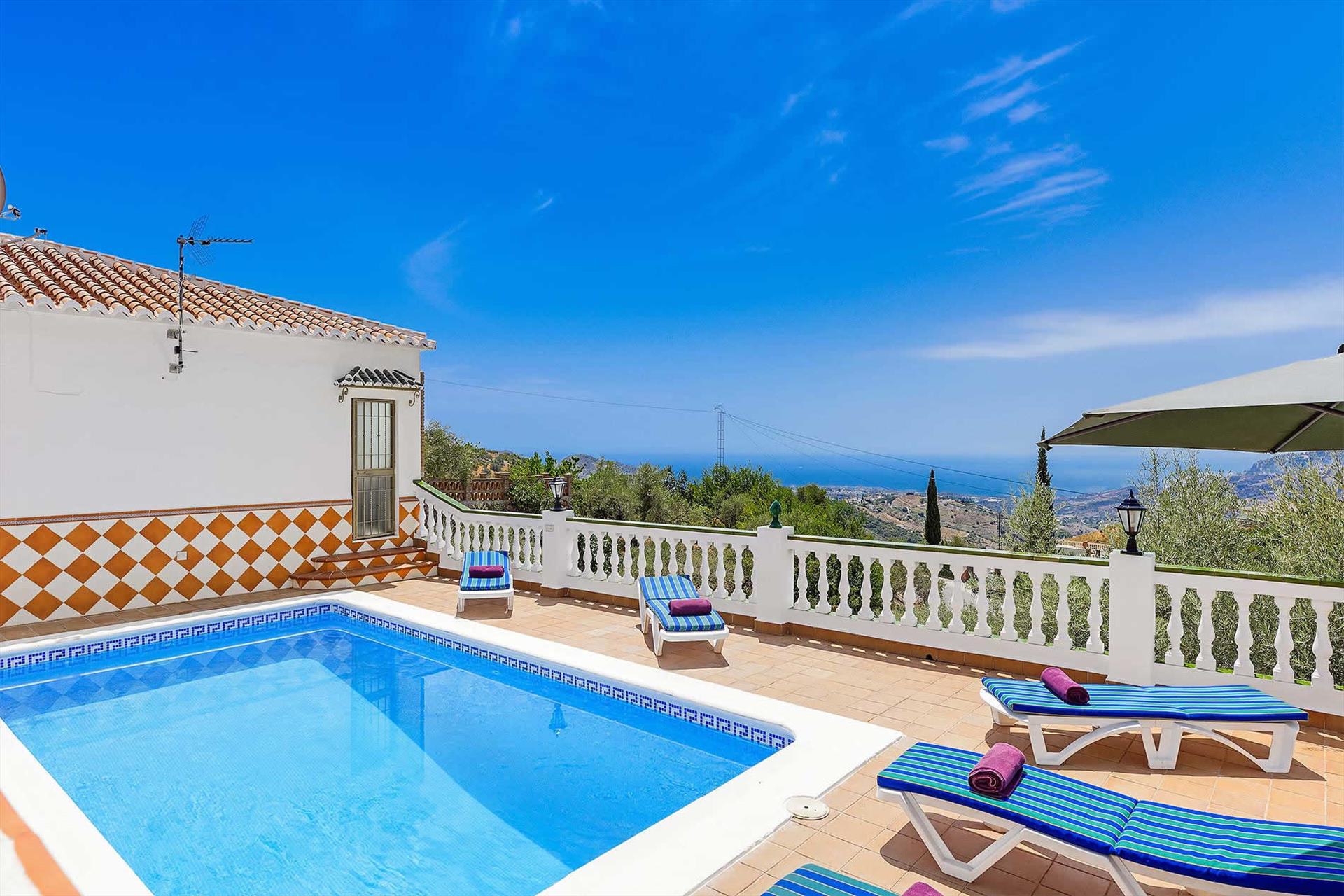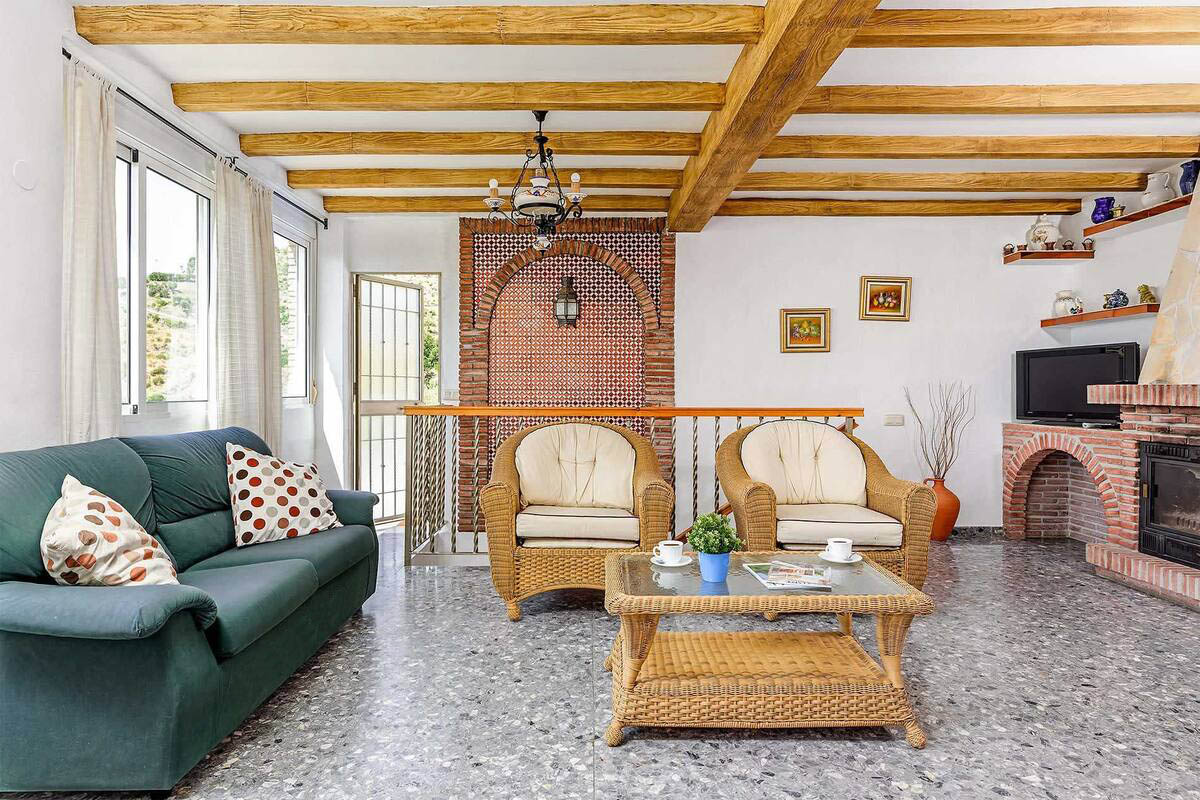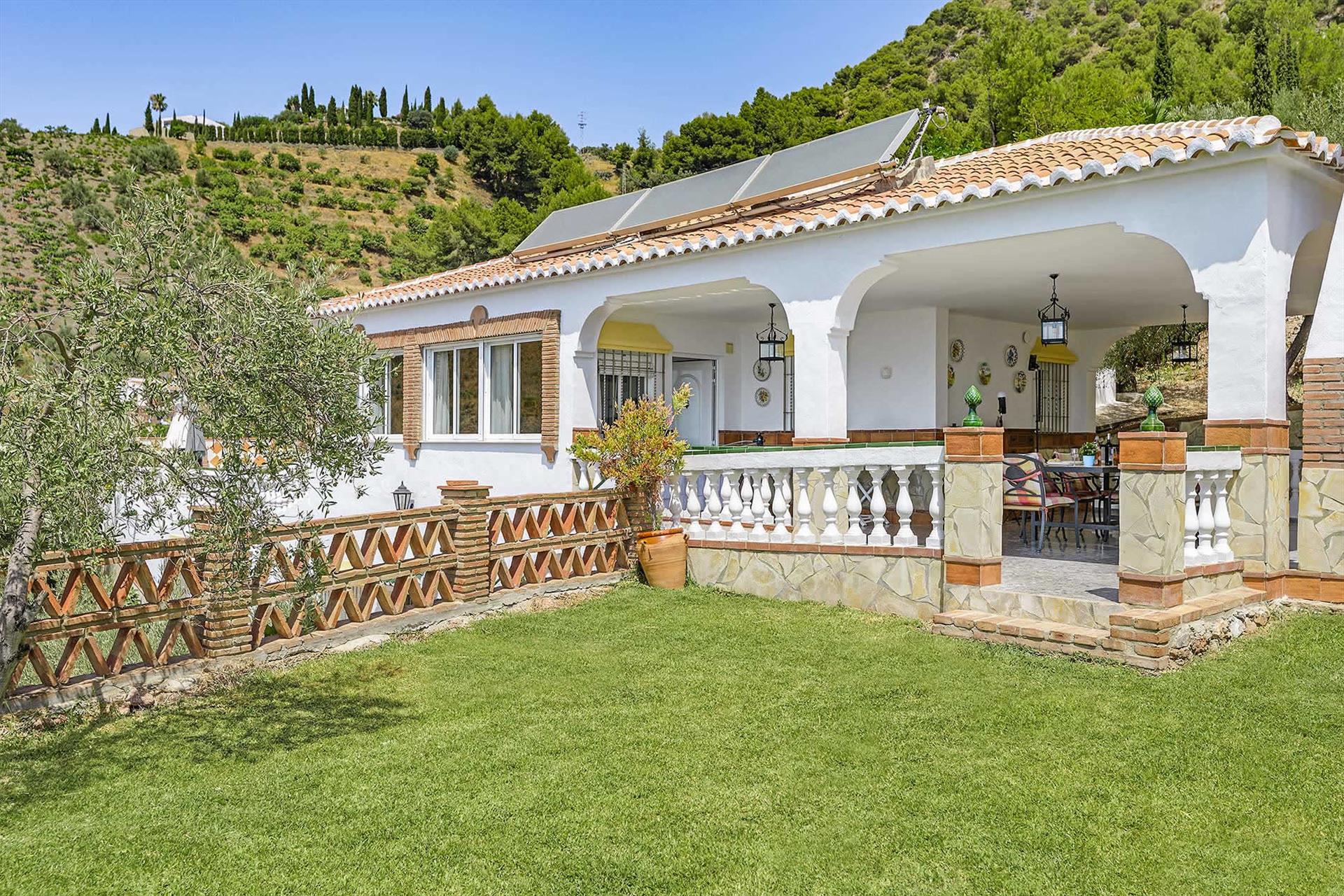 Das Haus schmiegt sich in einer die Umgebung überblickenden Höhe an einen Hügelhang, besitzt einen wundervollen, ruhigen Außenbereich und einen unvergleichlichen Ausblick. Ihre Mahlzeiten unter freiem Himmel werden Sie auf der hübschen Veranda mit dem angrenzenden, auf Rasen angelegten Obstgarten sicherlich am meisten genießen. Der attraktive vor Blicken geschützte Bereich des Swimmingpools (8 x 3 m) hat ebenfalls einen einzigartigen Blick. Die Umgebung ist sehr friedvoll und nur 5 Autominuten von Frigiliana (6 km) entfernt. Die Stadt Nerja, mit ihren berühmten Stränden und betriebsamem Zentrum erreicht man mit dem Auto in 15 Minuten (12 km). Eine gut geteerte Straße erleichtert die Zufahrt zum Haus und macht es zu einem perfekten Refugium, das man als Stützpunkt für Erkundungsfahrten nach Granada, Málaga und in die weißen Dörfer der Axarquia-Region nutzen kann.