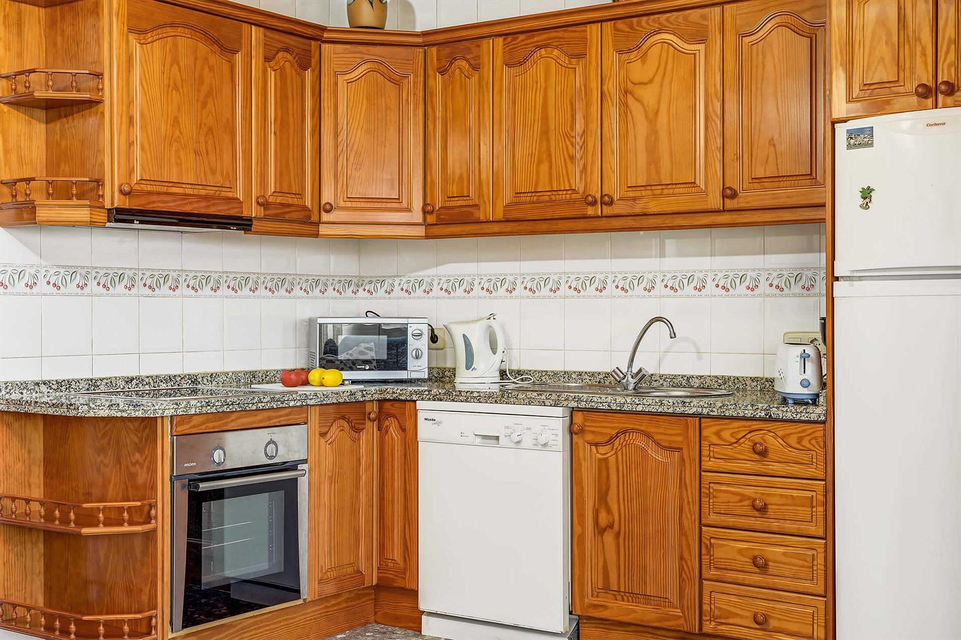 Es handelt sich um eine komfortable Villa mit zwei Etagen. Im Erdgeschoss befinden sich die Eingangshalle, die Treppe zum Obergeschoss, ein Schlafzimmer mit zwei Einzelbetten und Badezimmer sowie ein kleines Wohnzimmer. Die obere Etage hat ein geräumiges Wohnzimmer mit offenem Kamin und Satelliten-Fernsehen. Große (zumindest für spanische Verhältnisse) Fenster geben den Blick auf eine schöne Umgebung frei. Die offene Küche ist gut ausgerüstet und hat einen elektrischen Herd, Mikrowelle, Kühlschrank/Gefrierfach, sowie eine Waschmaschine. Auf dieser Etage finden Sie außerdem 2 Schlafzimmer (eines mit Doppelbett, das andere mit zwei Einzelbetten) und ein komplett ausgestattetes Badezimmer. Alles in allem hat das Haus ein ausgezeichnetes Preis-Leistungs-Verhältnis und eignet sich für den Sommerurlaub einer größeren Familie oder einer Gruppe von Freunden.