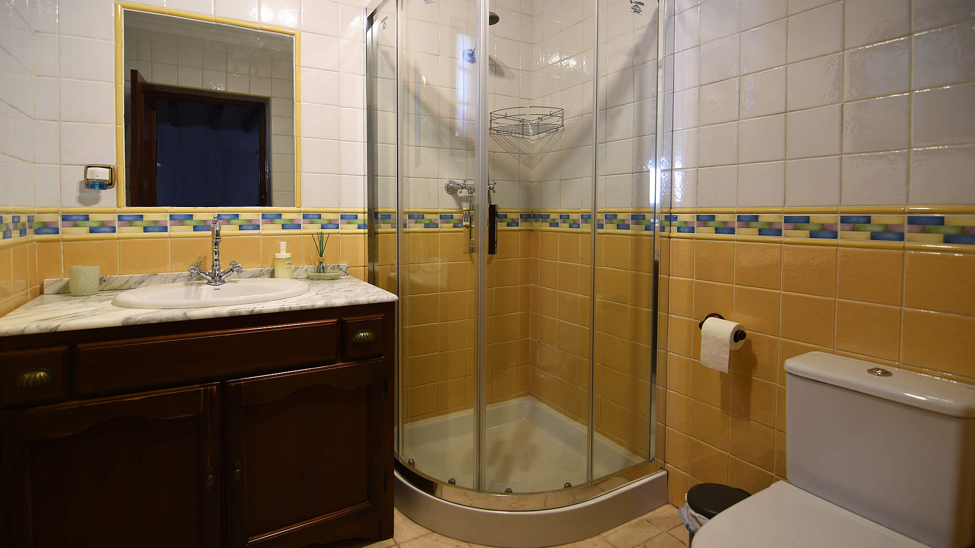 - Badezimmer mit Einzelwaschbecken, Dusche und Toilette