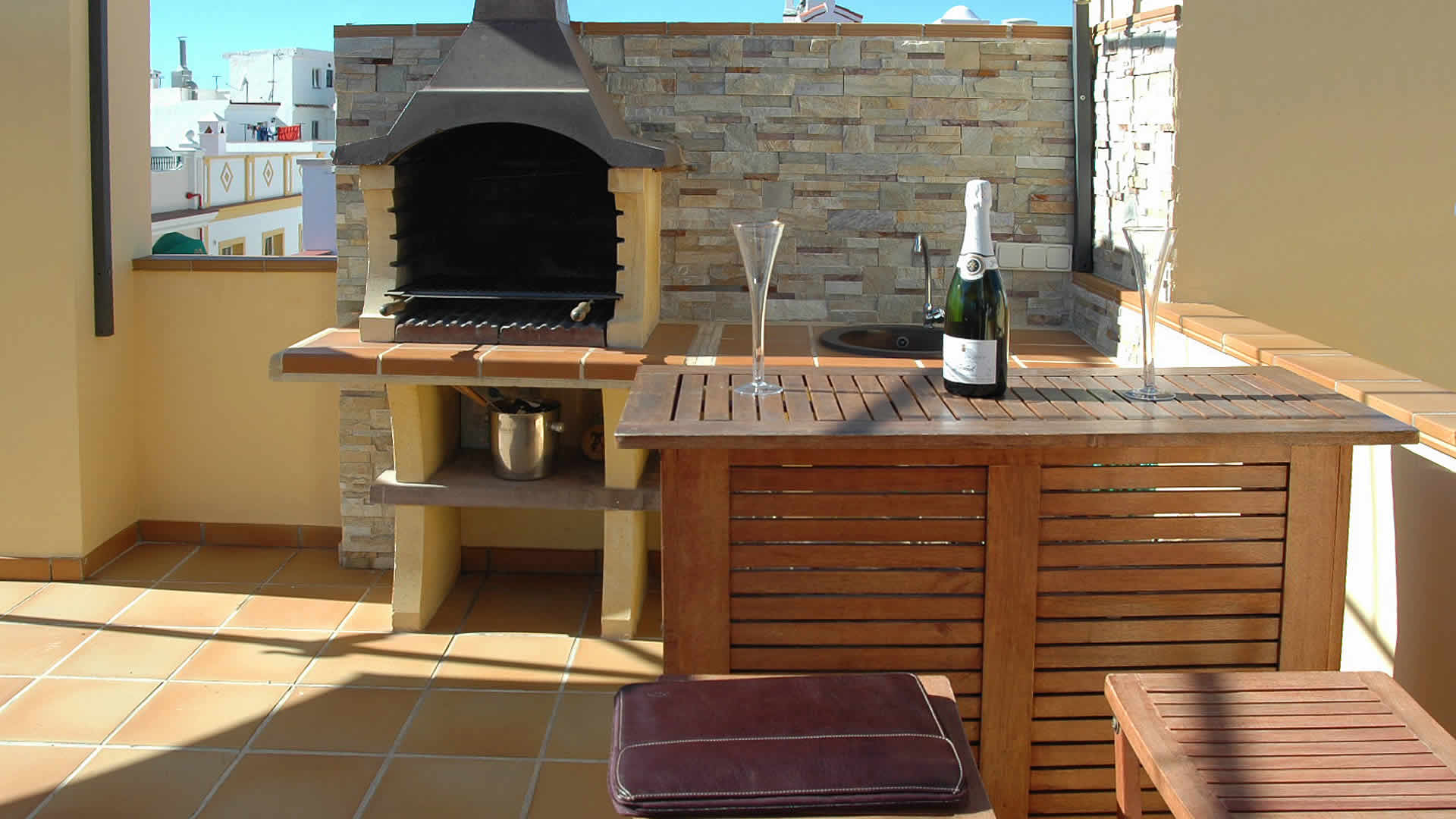 Wenn Sie Ihrem Auto ein paar Ferien gönnen wollen, dann lesen Sie weiter. Dieses Penthouse nimmt den gesamten ersten Stock eines Stadthauses in der Calle Huertos ein, einer ruhigen Straße mit ein bisschen Verkehr, aber keinerlei Lärm aus Bars oder Diskotheken. Zu den Stränden (250 m) und dem berühmten Aussichtsplatz Balcón de Europa (400 m) sind es nur 5 Minuten zu Fuß. Vom ersten Stock aus führt eine Treppe auf die Dachterrasse, wo Sie ein sichtgeschützter Pool (5.8x2.8 m) mit Duschraum erwartet. Eine Pergola sorgt für angenehmen Schatten. Sie können unter dem Sternenhimmel schwimmen, ein Dinner mit frischem Fisch vom Grill genießen oder Freunde zu einer Champagner-Party einladen. All das ist hier im Bereich des Möglichen. Sollten Sie jedoch auch die herrlichen Sehenswürdigkeiten Andalusiens erkunden wollen, dann empfehlen wir einen Besuch der Alhambra in Granada — das können Sie mit einem Sightseeing-Bus tun, falls Sie nicht selbst am Steuer sitzen wollen. Die Stadt Malaga ist für ihr Picasso-Museum berühmt und hier finden Sie auch eine umwerfende Auswahl an Tapa-Bars, wenn Sie die einheimische Küche probieren wollen. Immer noch nicht überzeugt? Werfen wir einen Blick ins Innere...
