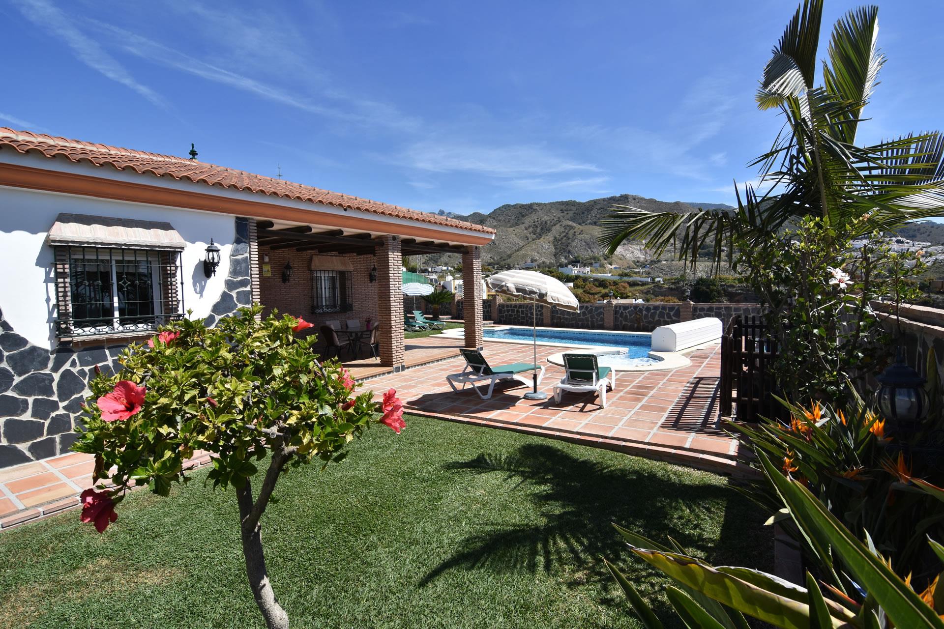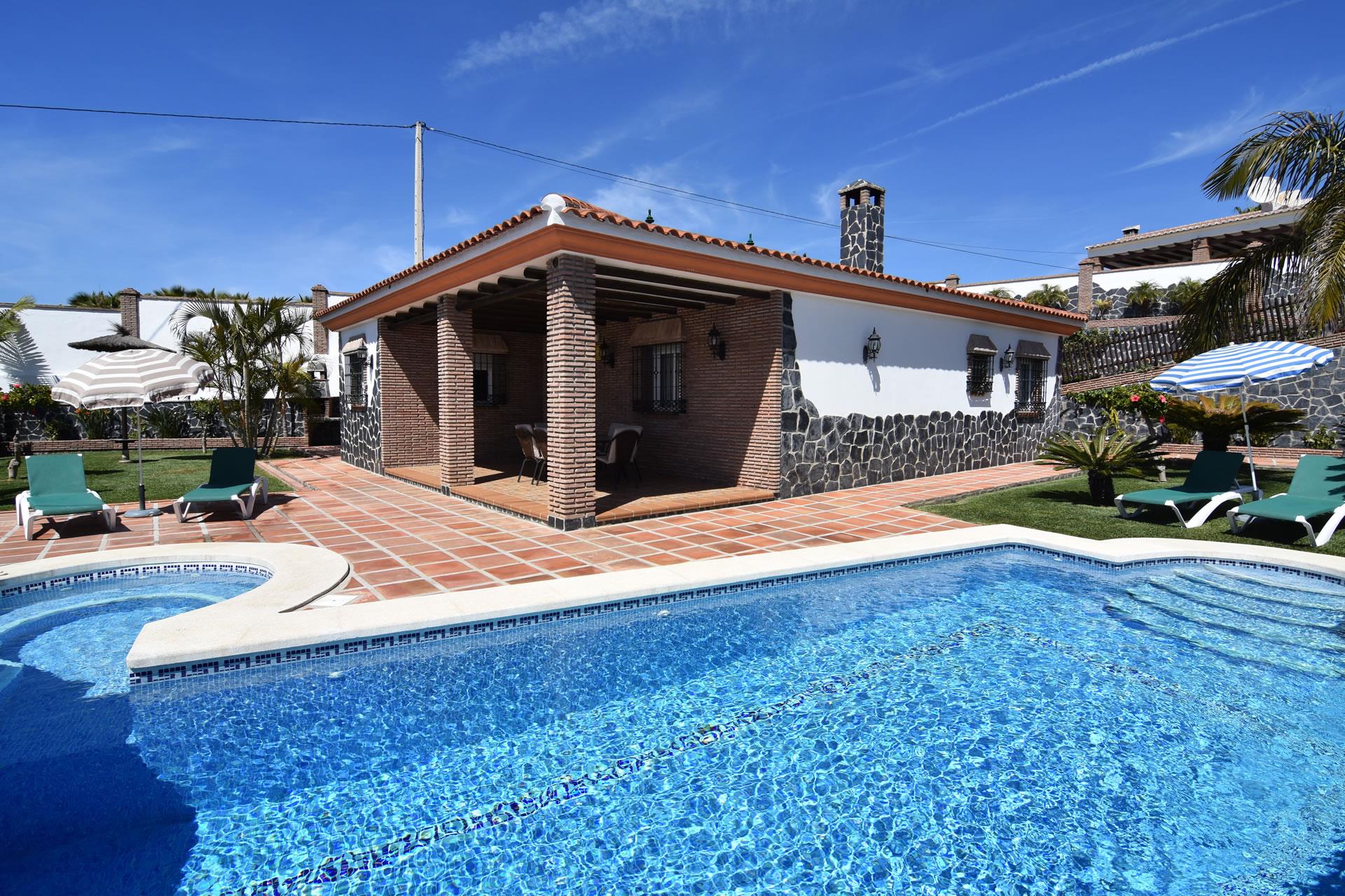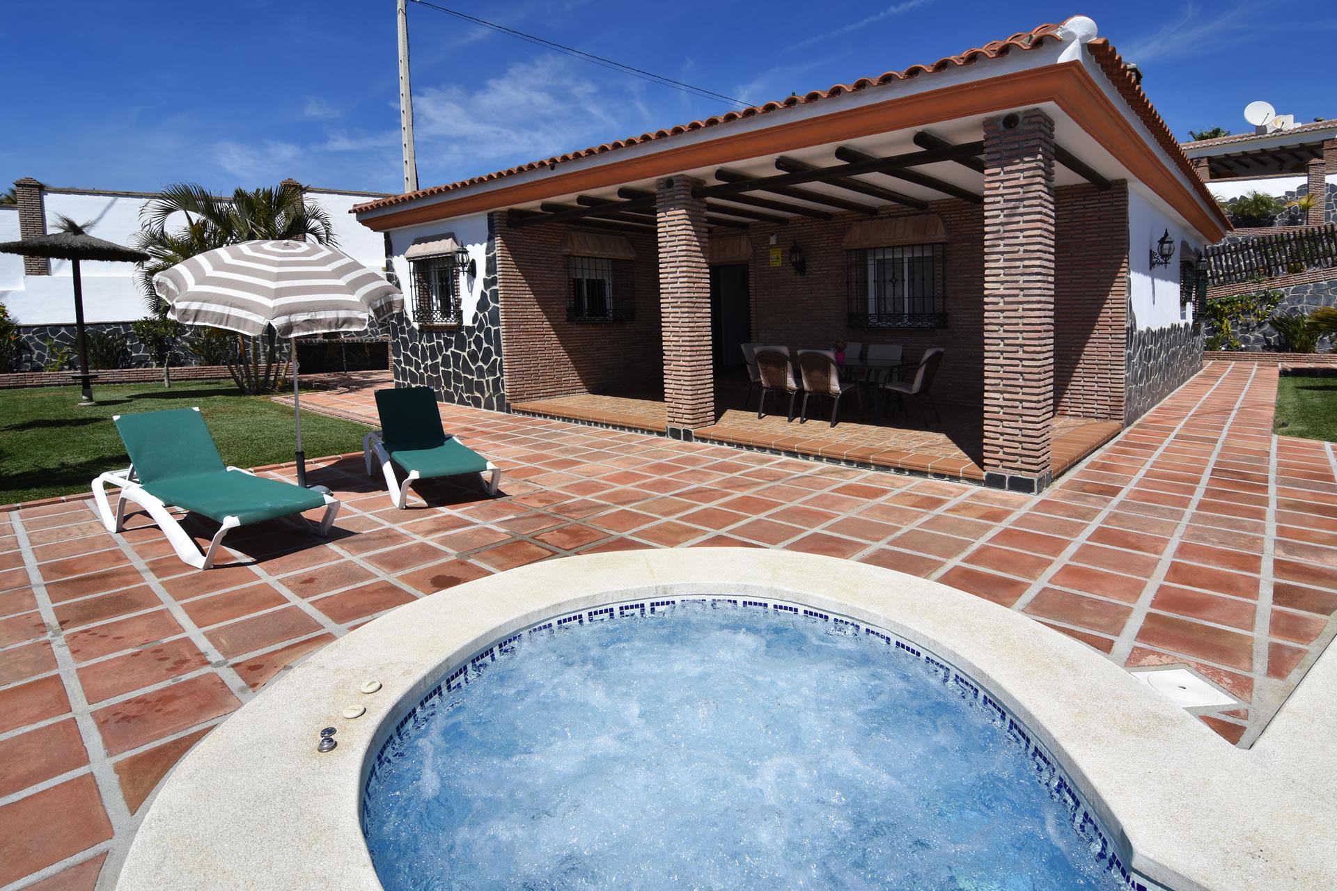 Dieser reizende Bungalow, dessen Garten durch eine Mauer abgegrenzt ist, bettet sich wundervoll in die ruhige Umgebung ein. Nerjas zahlreiche Shops und Restaurants sind nur eine kurze Fahrt entfernt (2,2 Km). Zum herrlichen Garten mit großzügiger Grünfläche gehört auch eine Sonnenterrasse mit privatem Swimmingpool (8,5 x 4 m) und angegliedertem Whirlpool (2,20 m Durchmesser). Die schöne Veranda, die mit Gartenmöbeln ausgestattet ist, ist das ideale Plätzchen für gemütliche Grillabende. Granada mit der weltberühmten Alhambra oder Málaga mit der Burganlage Castillo de Gibralfaro sind nur eine Stunde entfernt. Sie schrecken auch vor längeren Fahrten nicht zurück? Dann sollten Sie unbedingt die zauberhaften Städte Sevilla und Córdoba im Landesinneren besuchen.