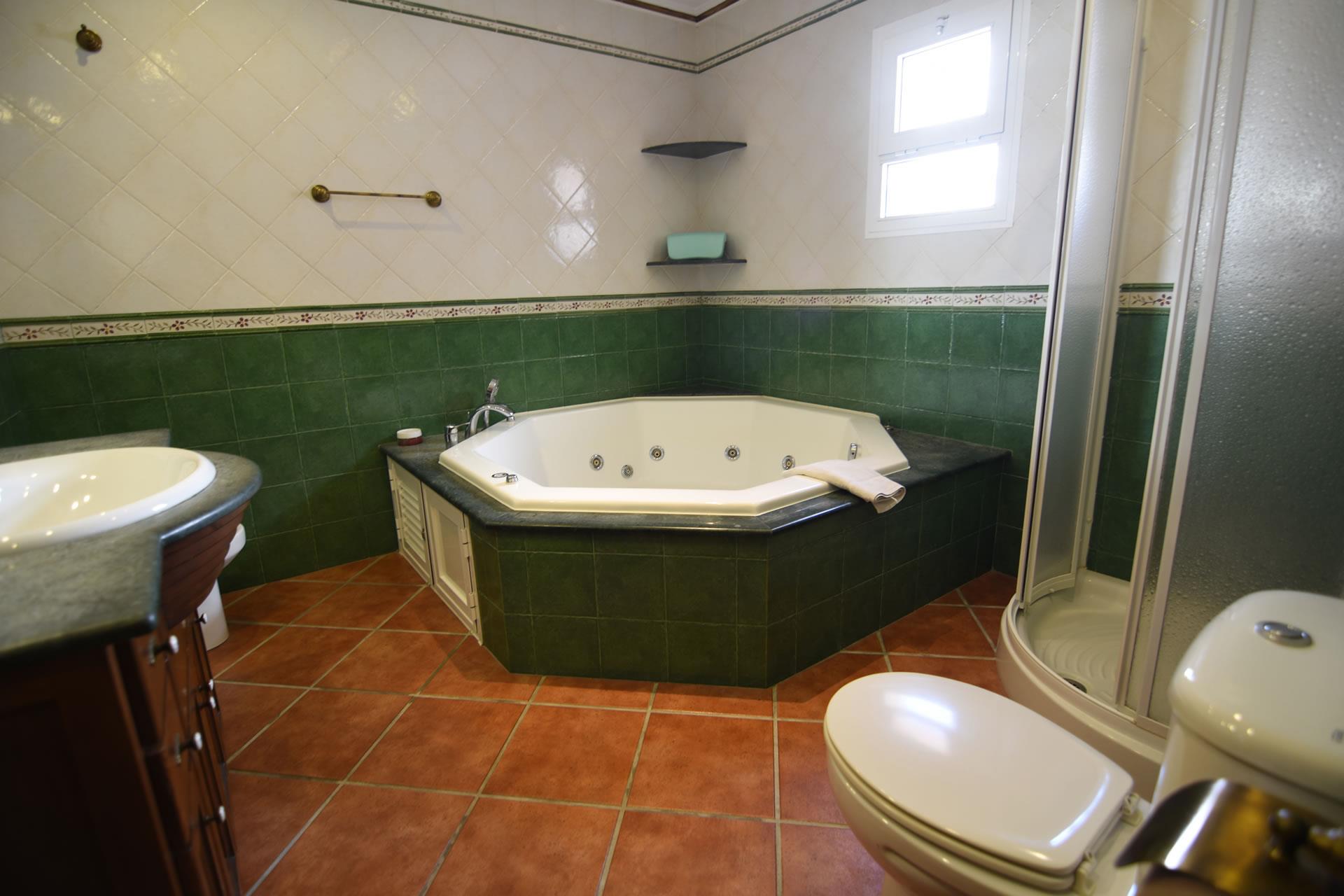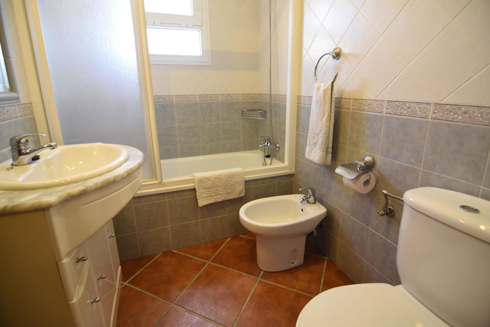 - 2 Badezimmer jedes mit Einzelwaschbecken, Duschbadewanne, Bidet und Toilette