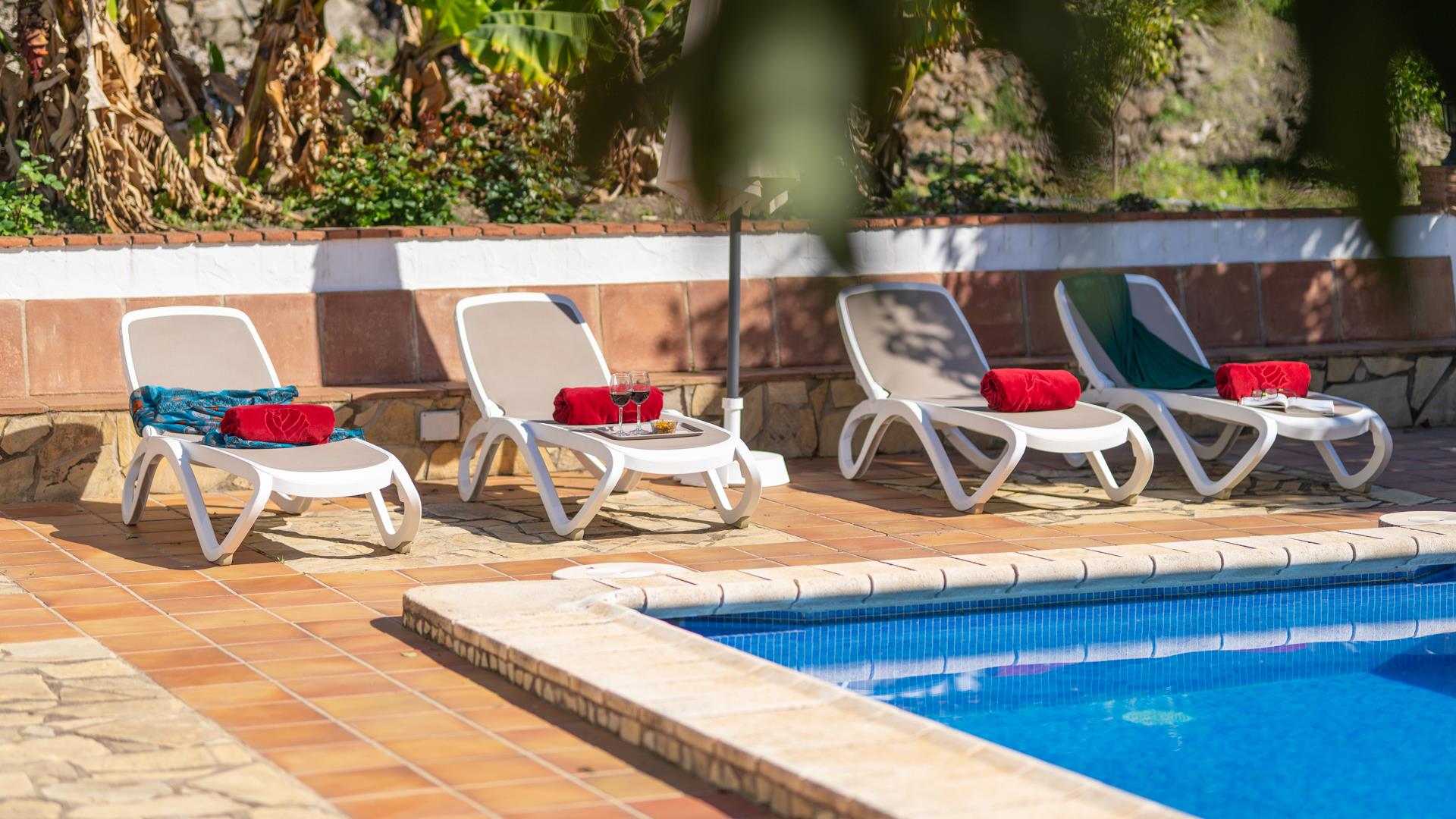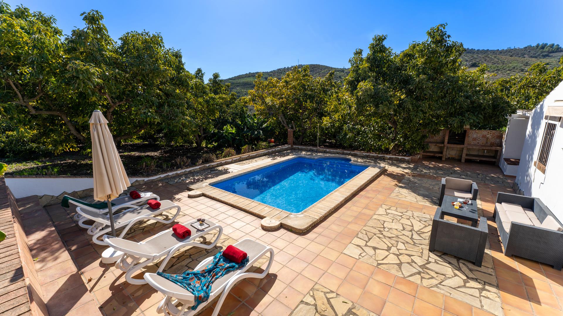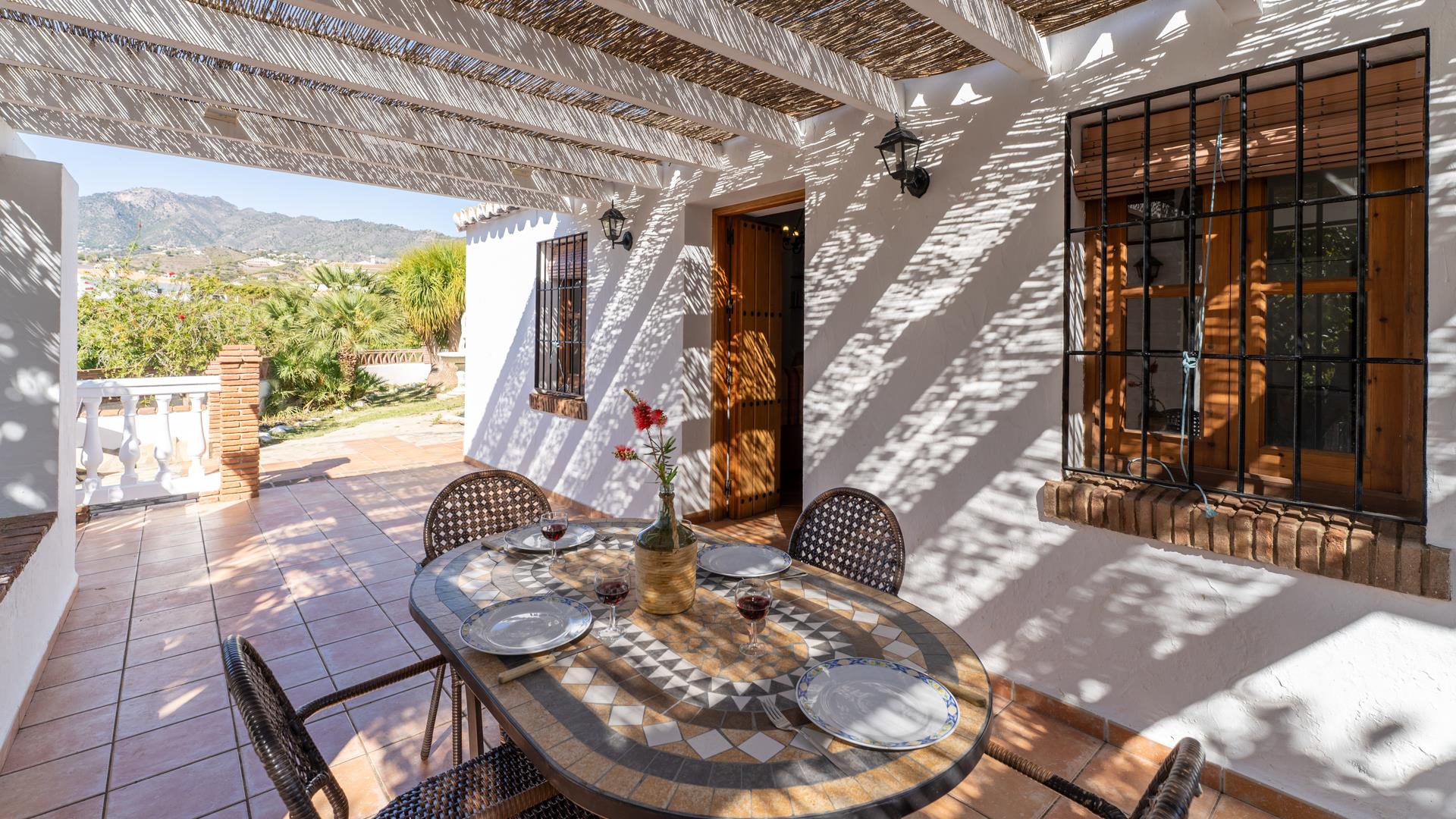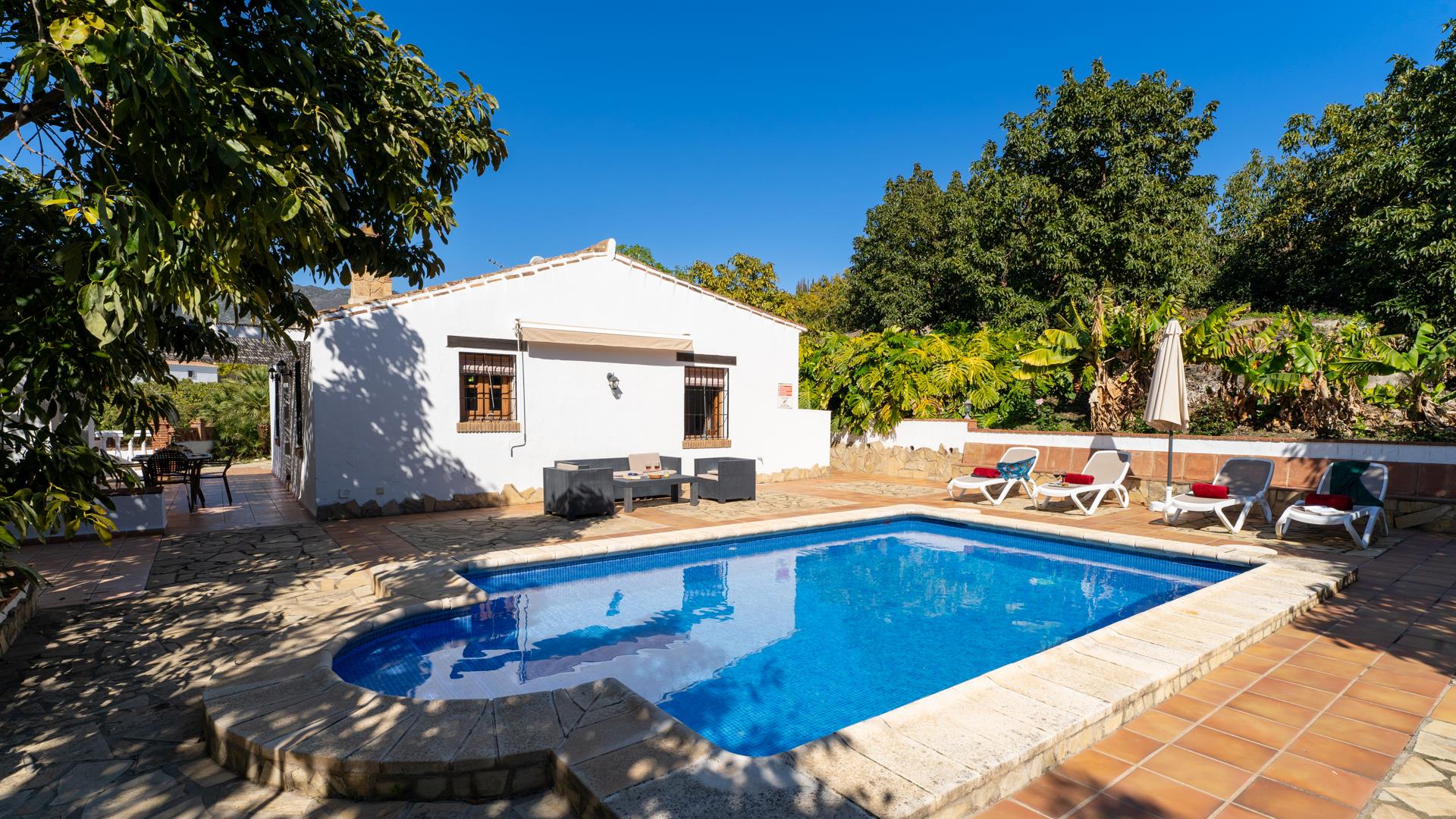Dieses ländliche Ferienhaus befindet sich auf einem 11 000 m² großen Privatgrundstück und ist rundum von Avocadohainen umgeben. Hier können Sie einen erholsamen Urlaub fernab jeder Hektik genießen, ohne auf den Strand, den Einkaufsbummel oder den Genuss der Tapas einer einheimischen Bar verzichten zu müssen. Sie können entweder nach Frigiliana (3 km) oder Nerja (4 km) fahren. Diese beiden andalusischen Ortschaften sind nur 10 Autominuten entfernt. Der Bereich um den hauseigenen Pool (6 x 4 m; 1,15 m - 1,60 m tief) und die Sonnenterrasse sind mit Liegestühlen und einer Sitzgarnitur ausgestattet. Neben dem Haus befindet sich eine schattige Veranda mit Gartenmöbeln, ein ausgezeichneter Ort für Mahlzeiten im Freien - ein Grill ist vorhanden. Am Eingang der Villa hat man einen einladenden kleinen Garten mit Blumen, einen Brunnen und eine kleine Sitzecke mit Blick auf die Landschaft.