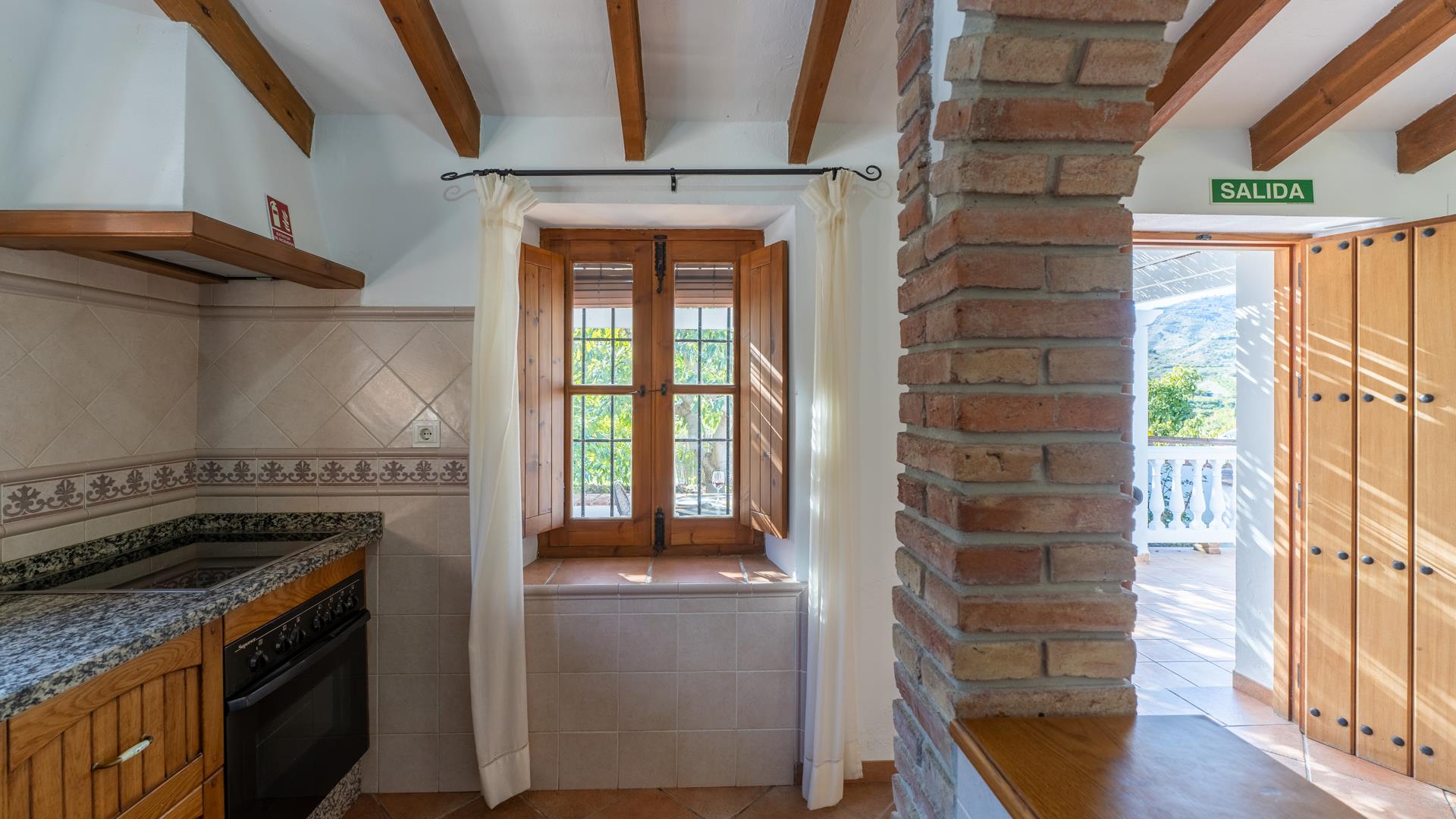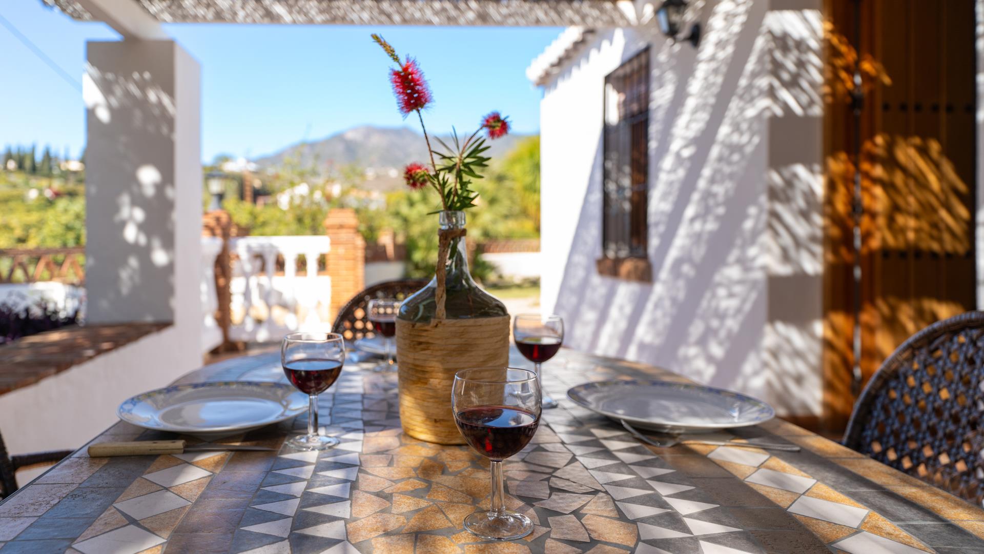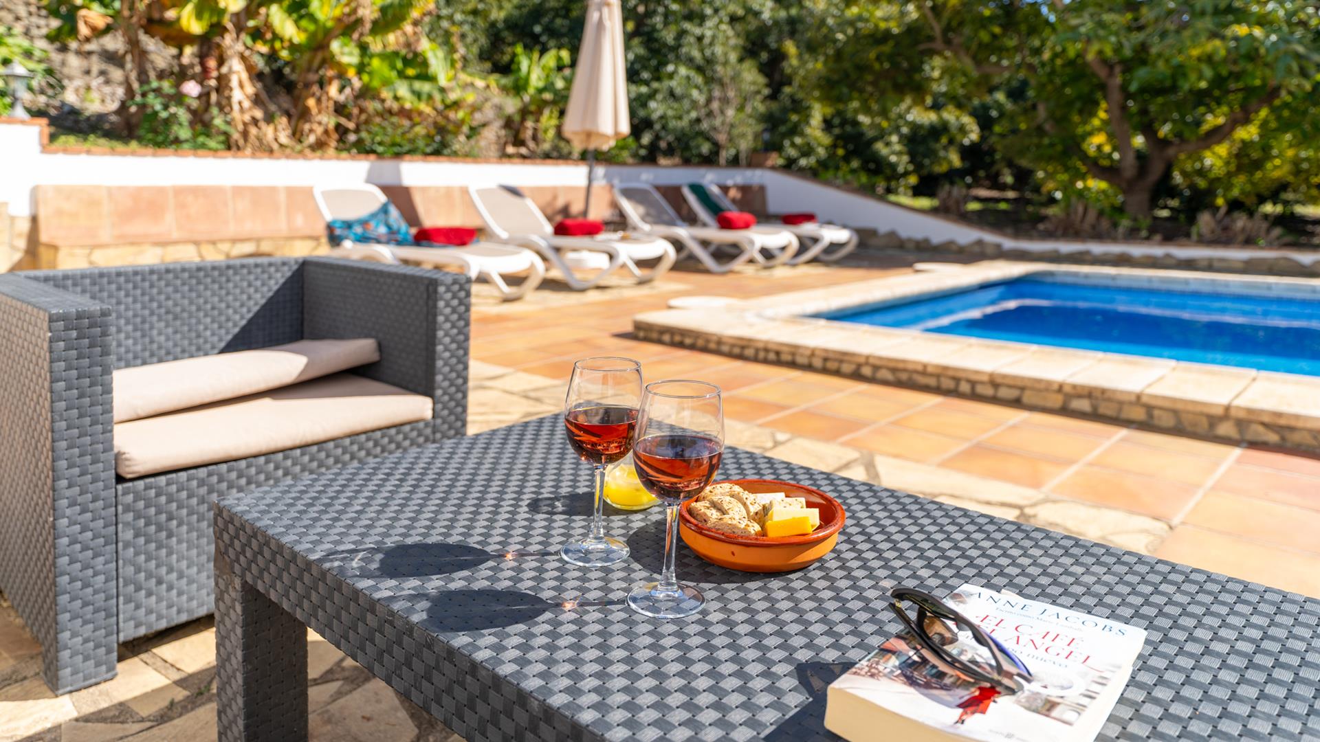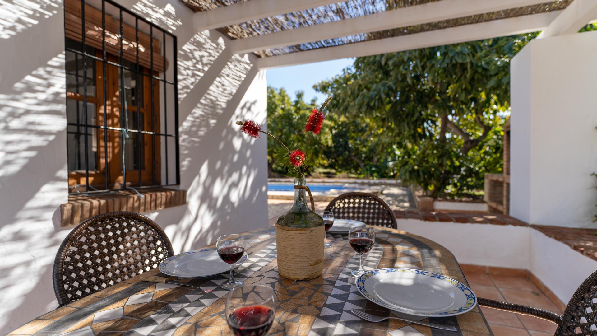 Dieses ländliche Ferienhaus befindet sich auf einem 11 000 m² großen Privatgrundstück und ist rundum von Avocadohainen umgeben. Hier können Sie einen erholsamen Urlaub fernab jeder Hektik genießen, ohne auf den Strand, den Einkaufsbummel oder den Genuss der Tapas einer einheimischen Bar verzichten zu müssen. Sie können entweder nach Frigiliana (3 km) oder Nerja (4 km) fahren. Diese beiden andalusischen Ortschaften sind nur 10 Autominuten entfernt. Der Bereich um den hauseigenen Pool (6 x 4 m; 1,15 m - 1,60 m tief) und die Sonnenterrasse sind mit Liegestühlen und einer Sitzgarnitur ausgestattet. Neben dem Haus befindet sich eine schattige Veranda mit Gartenmöbeln, ein ausgezeichneter Ort für Mahlzeiten im Freien - ein Grill ist vorhanden. Am Eingang der Villa hat man einen einladenden kleinen Garten mit Blumen, einen Brunnen und eine kleine Sitzecke mit Blick auf die Landschaft.
