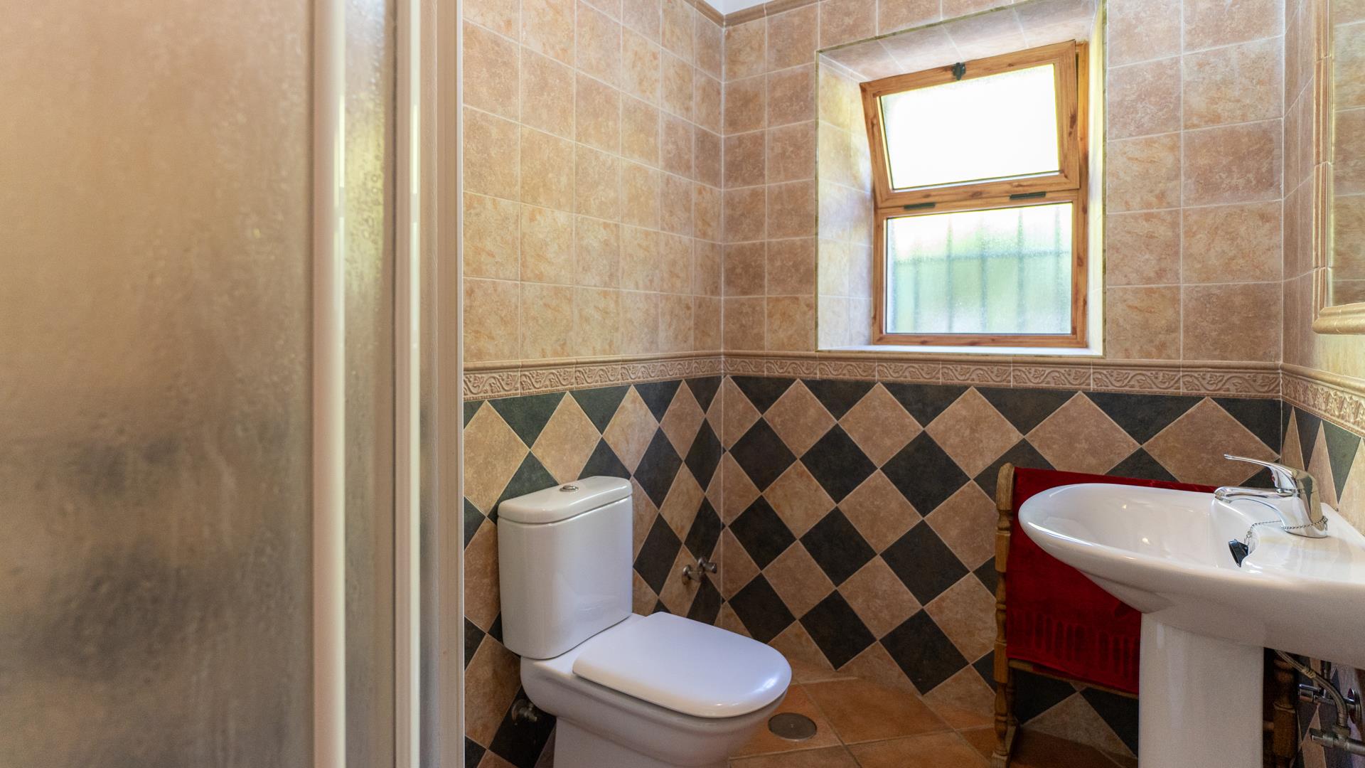 • Badezimmer mit Einzelwaschbecken, Dusche und Toilette
