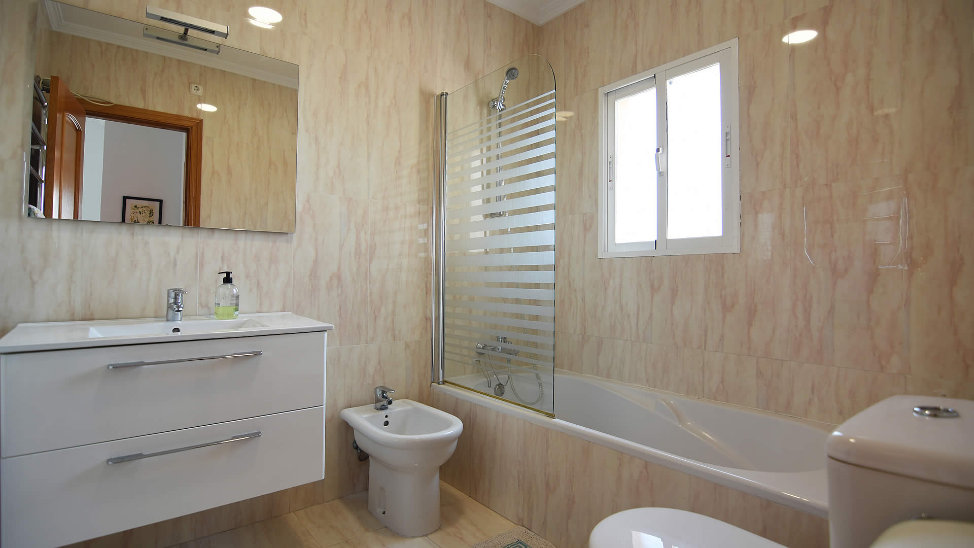 - Badezimmer mit Einzelwaschbecken, Duschbadewanne, Bidet und Toilette