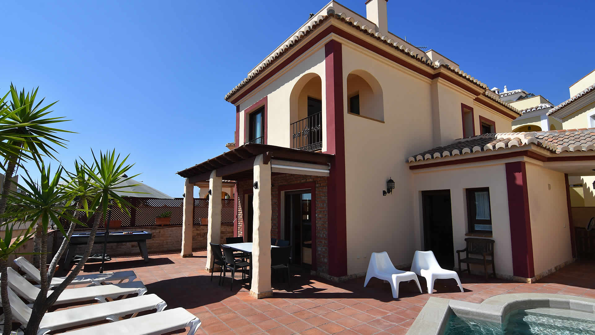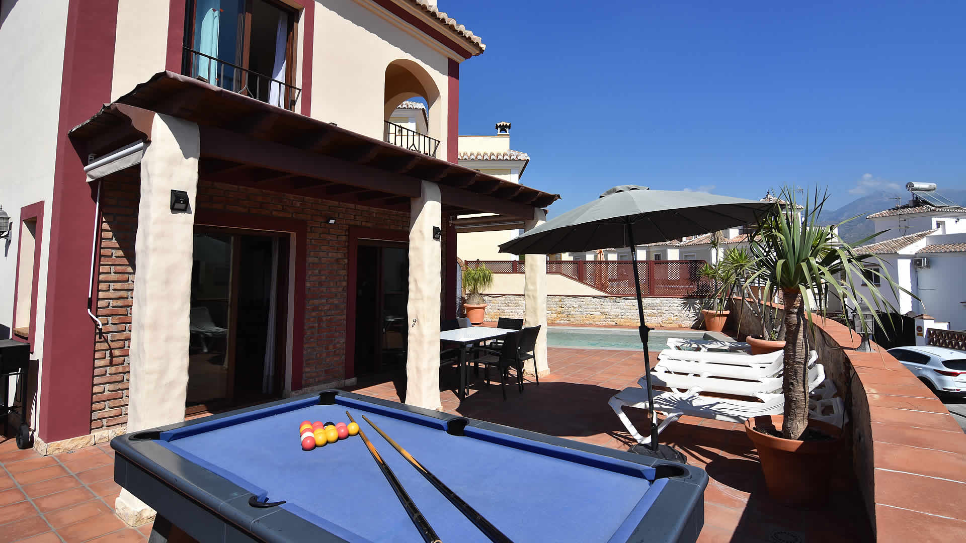 Auf der Terrasse gibt es einen Billardtisch und eine Tischtennis-Platte.