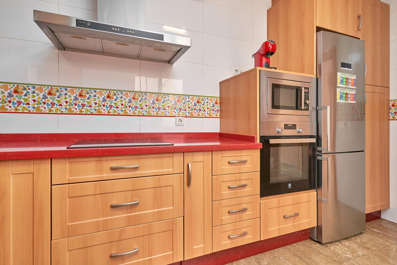 - Küche mit Elektroherd, Elektroofen, Mikrowelle, Geschirrspülmaschine, Kühl-Gefrierkombination, Kaffeemaschine, Wasserkocher, Toaster und Entsafter