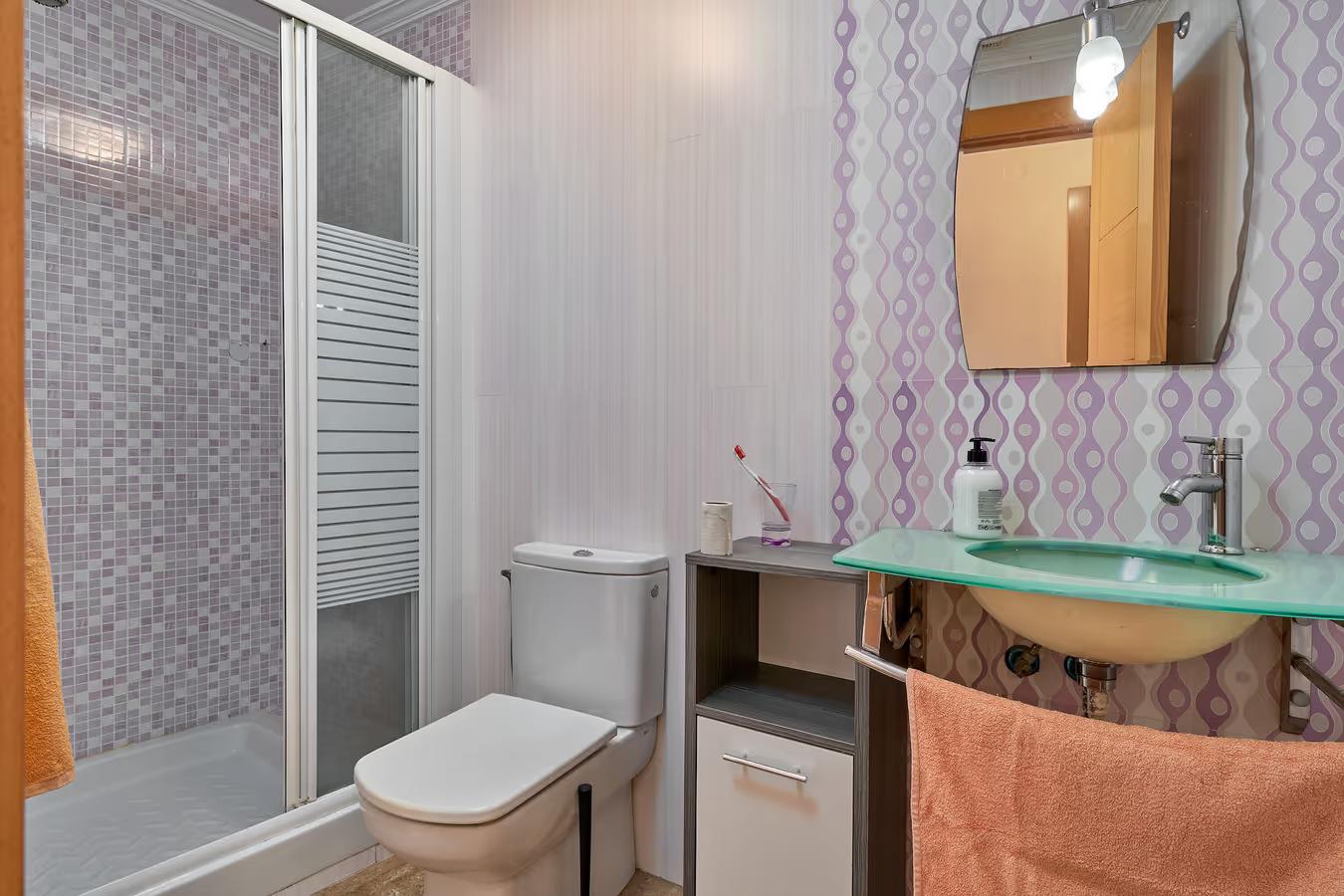 - Badezimmer mit Einzelwaschbecken, Dusche und Toilette