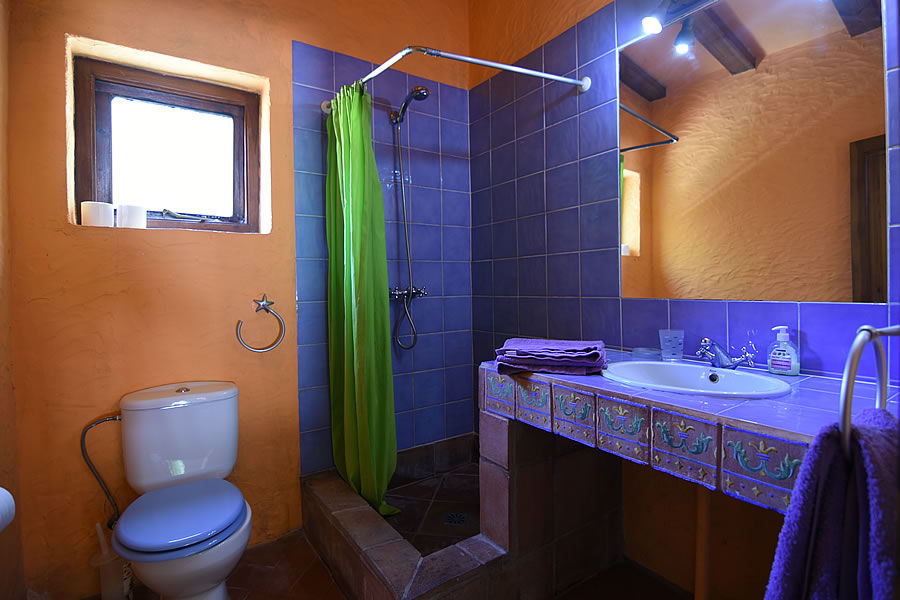 Eine hölzerne getäfelte Tür auf der rechten Seite führt in ein Badezimmer mit handbemalten andalusischen Fliesen. Auf der linken Seite gibt es eine Küche mit Gasherd (vier Ringe), Backofen, Kühlschrank, Toaster und Wasserkocher. Waschgelegenheit und Bügelbrett sind vorhanden. Ein Obstkorb begrüßt Sie und kostenfreies WLAN steht zur Verfügung.