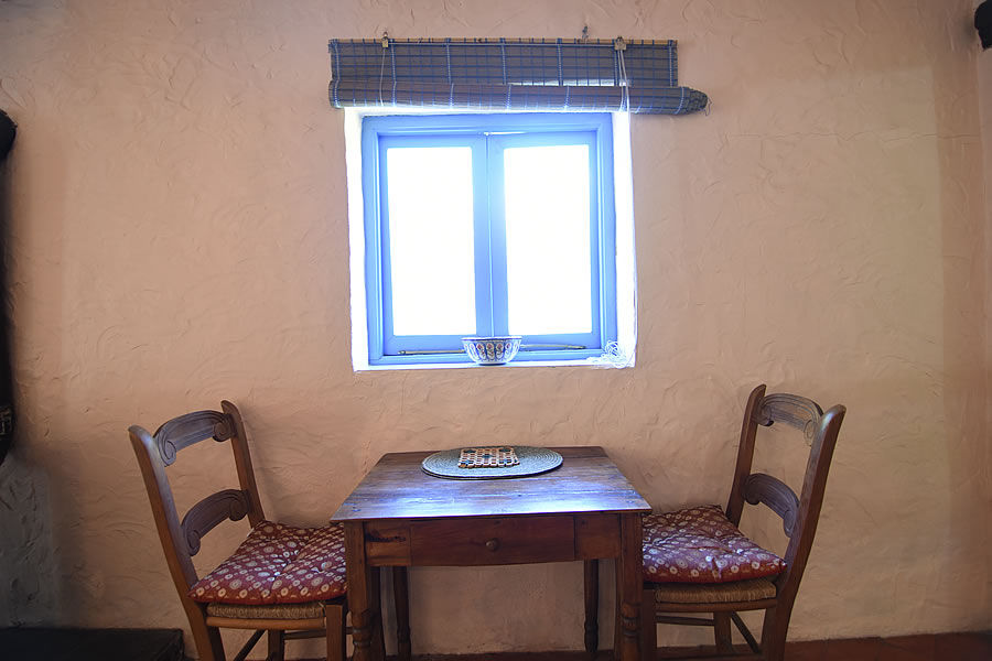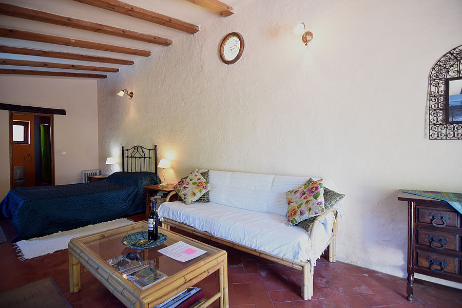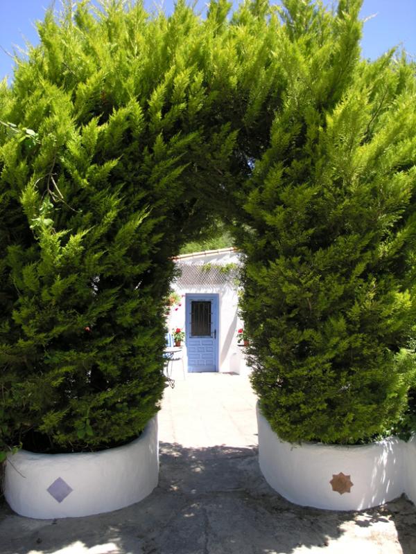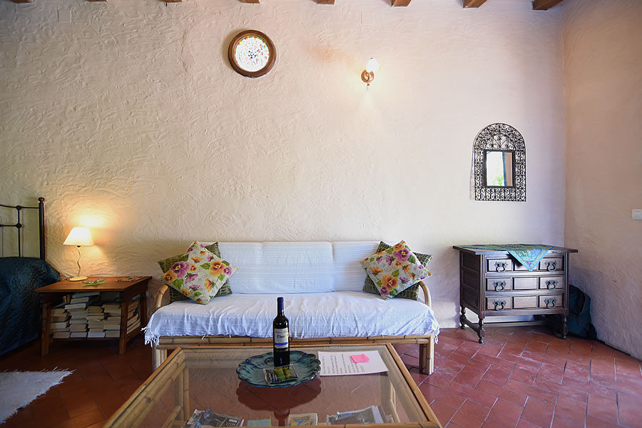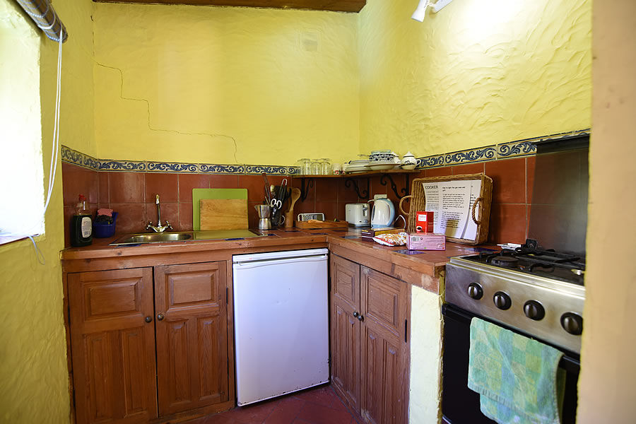 Eine hölzerne getäfelte Tür auf der rechten Seite führt in ein Badezimmer mit handbemalten andalusischen Fliesen. Auf der linken Seite gibt es eine Küche mit Gasherd (vier Ringe), Backofen, Kühlschrank, Toaster und Wasserkocher. Waschgelegenheit und Bügelbrett sind vorhanden. Ein Obstkorb begrüßt Sie und kostenfreies WLAN steht zur Verfügung.