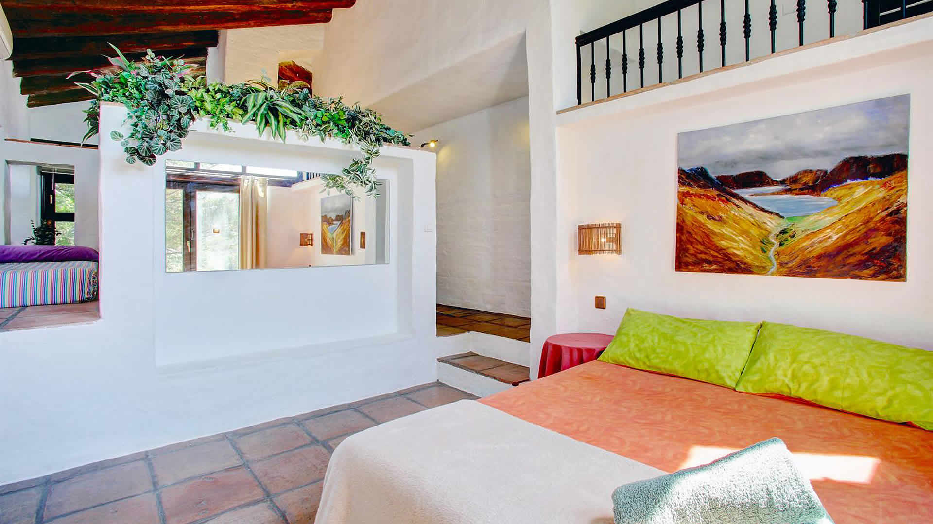 VILLA 3 (4 ERWACHSENE & 2 KINDER): Es ist das kleinste der Zwei-Schlafzimmer-Häuser auf der Hacienda, bietet jedoch bequem mehreren Gästen Platz. Während des Ausbaus wohnten hier der Architekt und seine Frau. Das Haus mit versetzten Wohnebenen steht abseits vom Hauptgebäude. Der Eingang liegt auf der mittleren Ebene, in der das Wohnzimmer und die Küche zu finden sind. Von hier führt eine Außentreppe zu einer begrünten, nach Süden hin ausgerichteten Veranda und in den Garten, von dem aus man das zweite Schwimmbad sehen kann. Im oberen Stock befindet sich ein Schlafzimmer mit Ankleideraum und eigenem Badezimmer. Dieses Haus ist das ideale Feriendomizil für eine größere Familie. Das zweite Schlafzimmer liegt im Untergeschoss und verfügt ebenfalls über ein eigenes Badezimmer. Der Ankleideraum ist so gestaltet, dass dort auf Wunsch noch zwei Einzelbetten aufgestellt werden können.