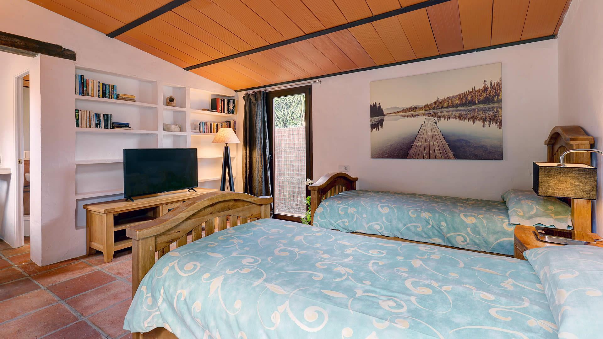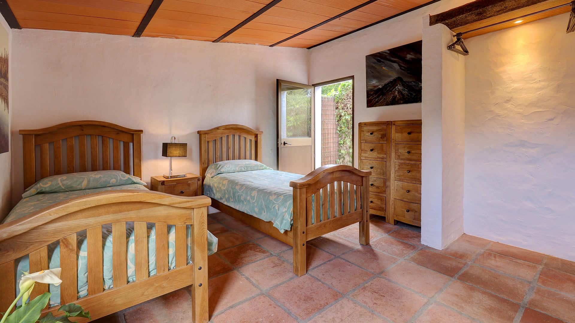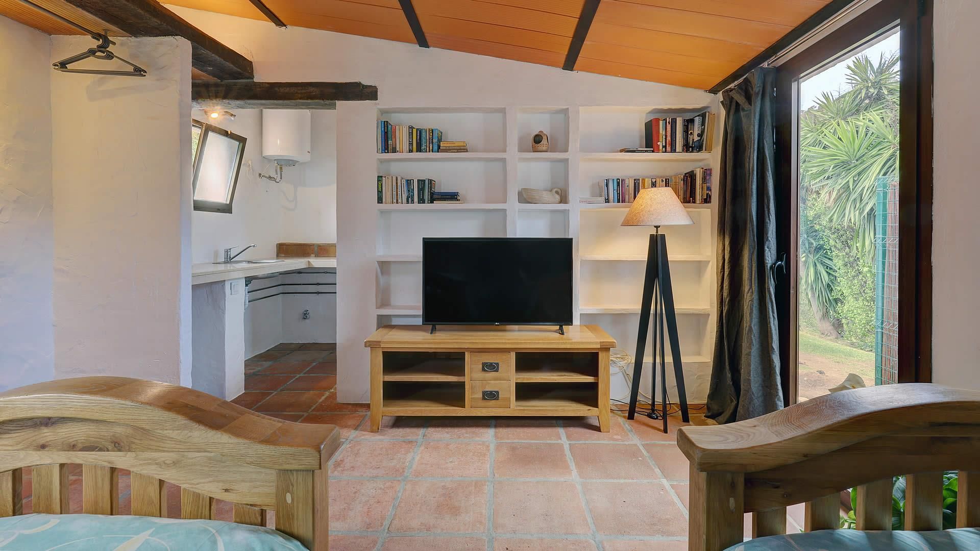 VILLA 5 (2 ERWACHSENE & 1 KIND): Es liegt etwas abseits und war ursprünglich die Unterkunft während des Baus der anderen Häuser. Es beeindruckt in seiner Architektur vielleicht etwas weniger als die anderen, hat dafür jedoch die die meiste Privatsphäre. Nach nur ein paar Schritten über den Rasen gelangen Sie zu einem der beiden Schwimmbecken. Die mit Weinranken überdachte Terrasse ist im Winter ein geschützter Ort, um die Sonne zu genießen, im Sommer dagegen ein schattiger Aufenthaltsort. Das Schlafzimmer verfügt über zwei Einzelbetten und eine eigene Dusche. Der Wohnraum ist mit runden Deckenbalken und einem offenen Kamin ausgestattet. Eine tiefe gepolsterte Fensternische ist ein gemütlicher Platz, von dem die Sierra Bermeja zu sehen ist und kann sogar in ein großes Einzelbett umgewandelt werden.